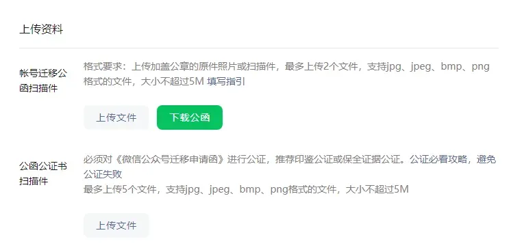 很多用户在进行公众号迁移时,都会卡在【填写资料】那一步,因为这里需要上传迁移函和微信公众号迁移公证书。
