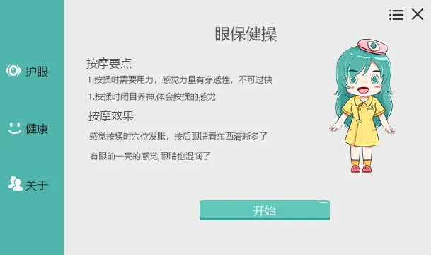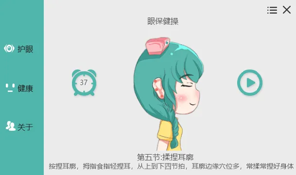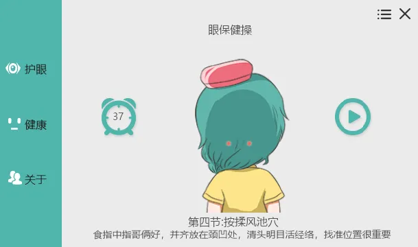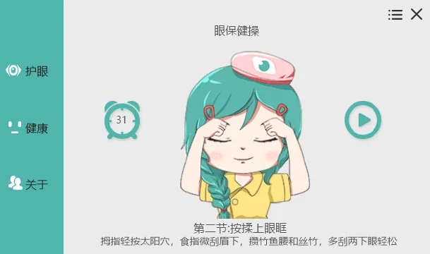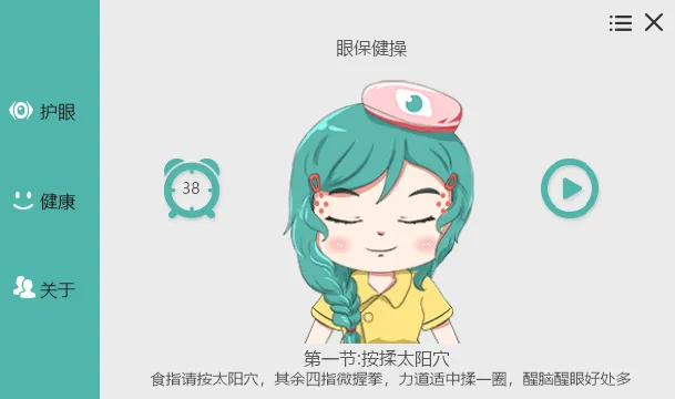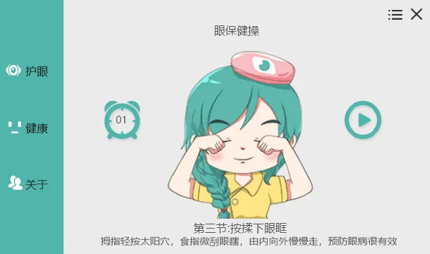 标准眼保健操:休息时可跟随声音提示做眼保健操,包含五个动作,每个动作四个八拍: