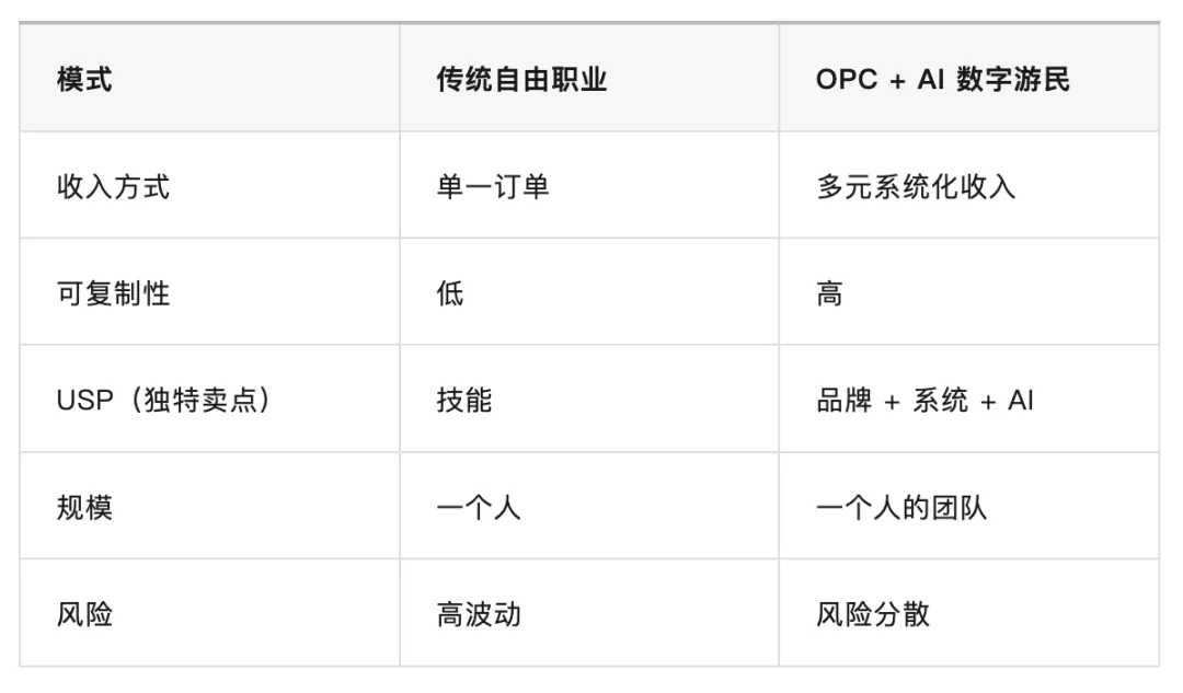 第一代数字游民靠远程写作、翻译、图像/视频剪辑缓慢生存;现在的第二代数字游民靠 AI + OPC 构建可规模化的个人事业。