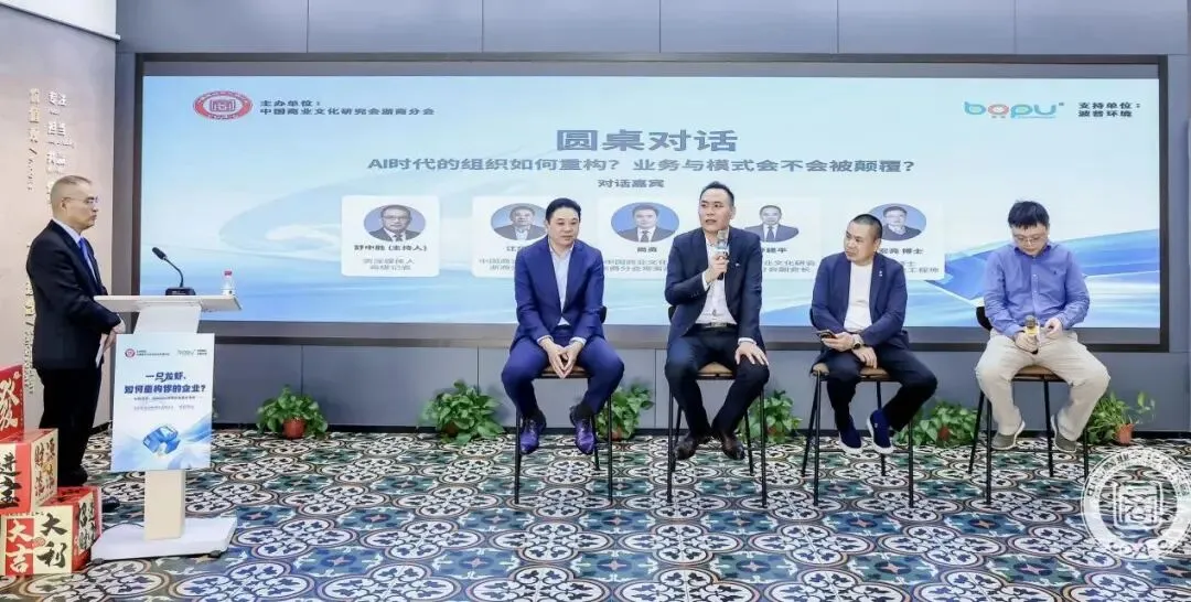 资深媒体人、高级记者舒中胜主持圆桌对话,中国商业文化研究会浙商分会会长江华平、常务副会长尚勇、副会长舒建平,授课博士高宏亮共同参与交流研讨。嘉宾们围绕“AI时代的组织如何重构?业务与模式会不会被颠覆?”展开深度探讨,来自不同行业的代表结合自身实践,从管理创新、业务转型、商业模式重构等角度分享独到观点,既有宏观趋势研判,也有微观实操经验,为在场企业家带来高维度认知升级。