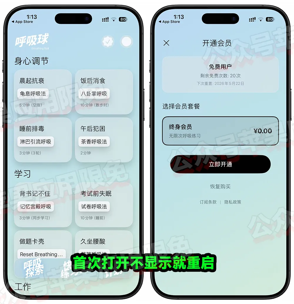 一款呼吸工具,目前可以免费获取它的终身会员,打开软件点击顶部对号进入内购,终身显示0即可免费获取,设备需装有 iOS 16.6 或更高版本。