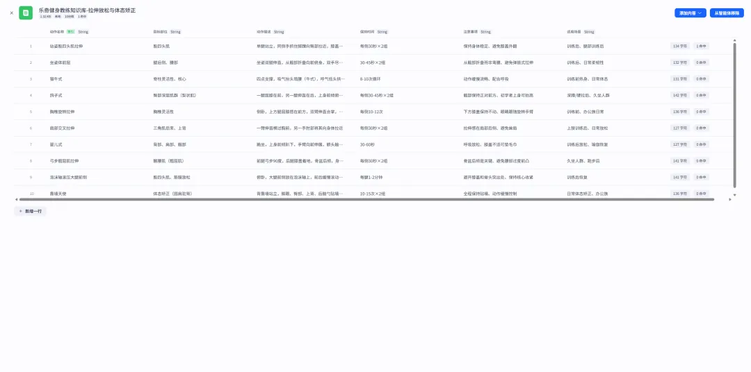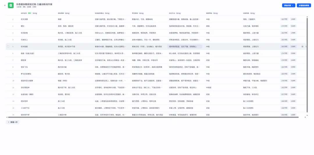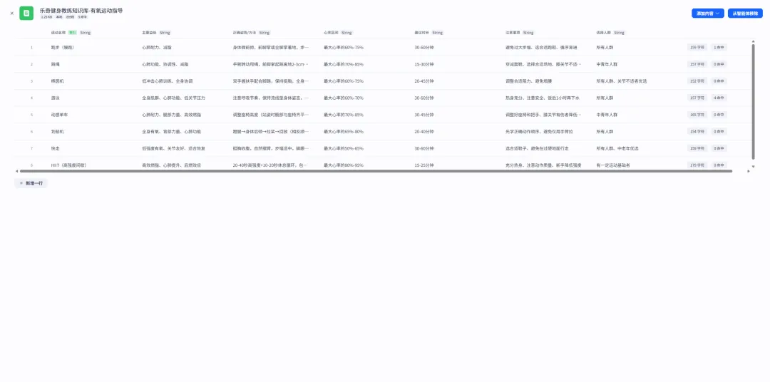知识库是保证回答准确性的关键。我用Excel整理了一套结构化的健身知识库,分为三个模块: