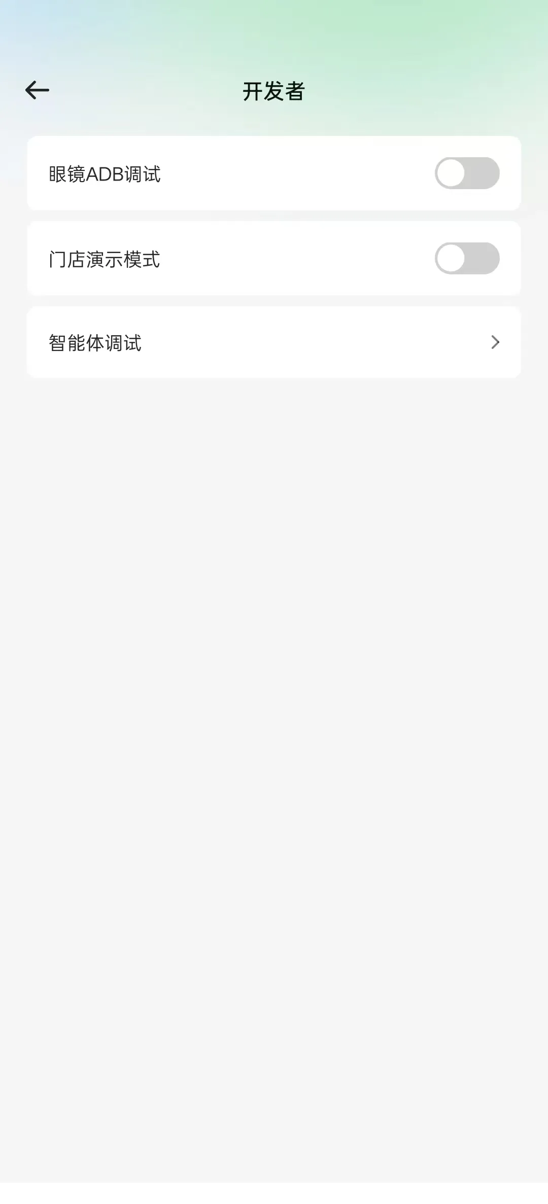 打开 Rokid AI 手机 App,连接 Glasses;在设备Tab 右上角的设置里找到开发者选项,点击进入后可以看到账户下的智能体。