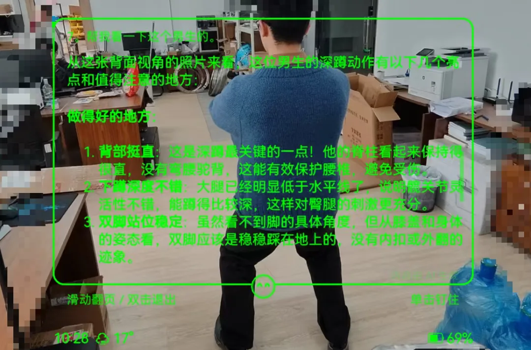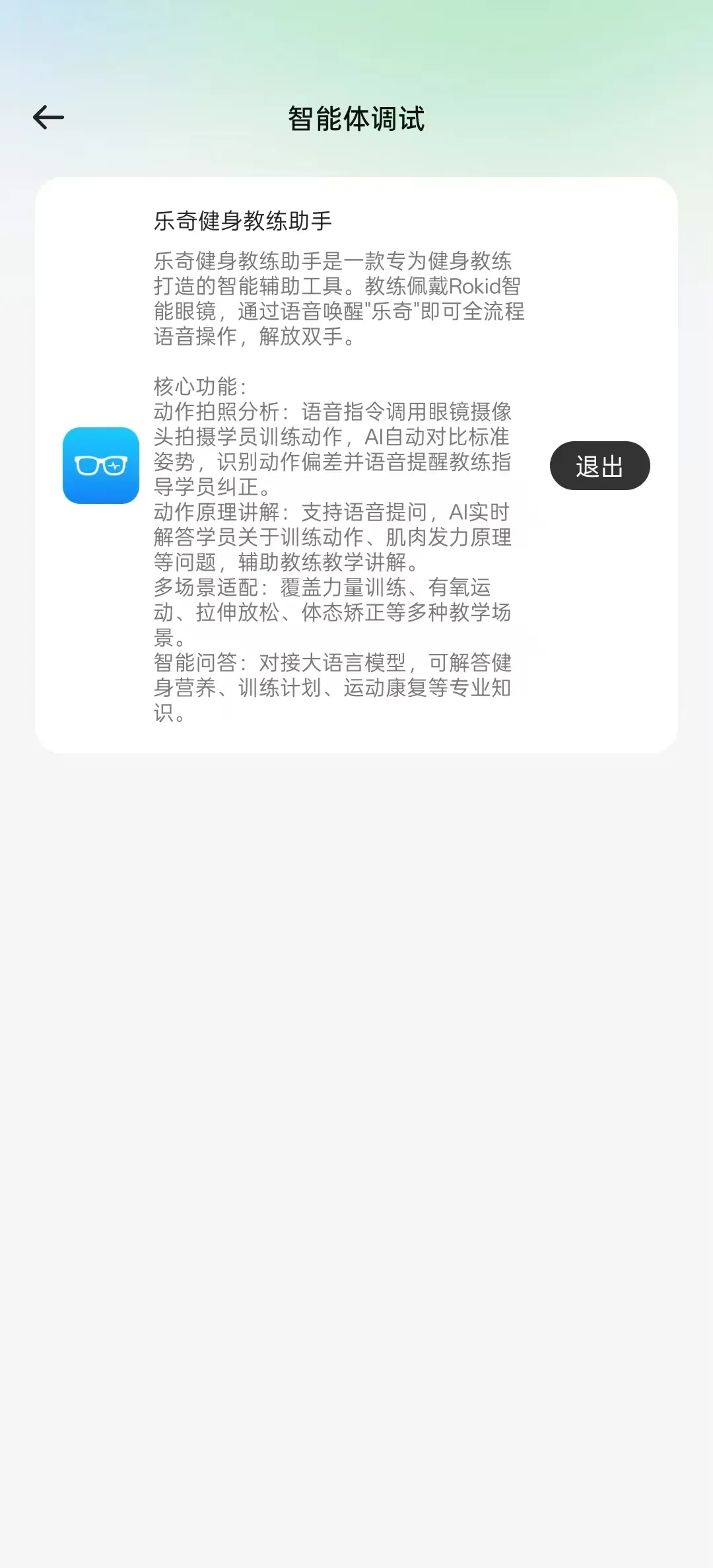 我尝试用Rokid智能眼镜解决这个问题——开发了一款名为“乐奇健身教练助手”的智能体。教练佩戴眼镜后,语音唤醒“乐奇”即可触发拍照分析、动作讲解、学员答疑等功能,全程语音操作,不需要触碰任何设备。