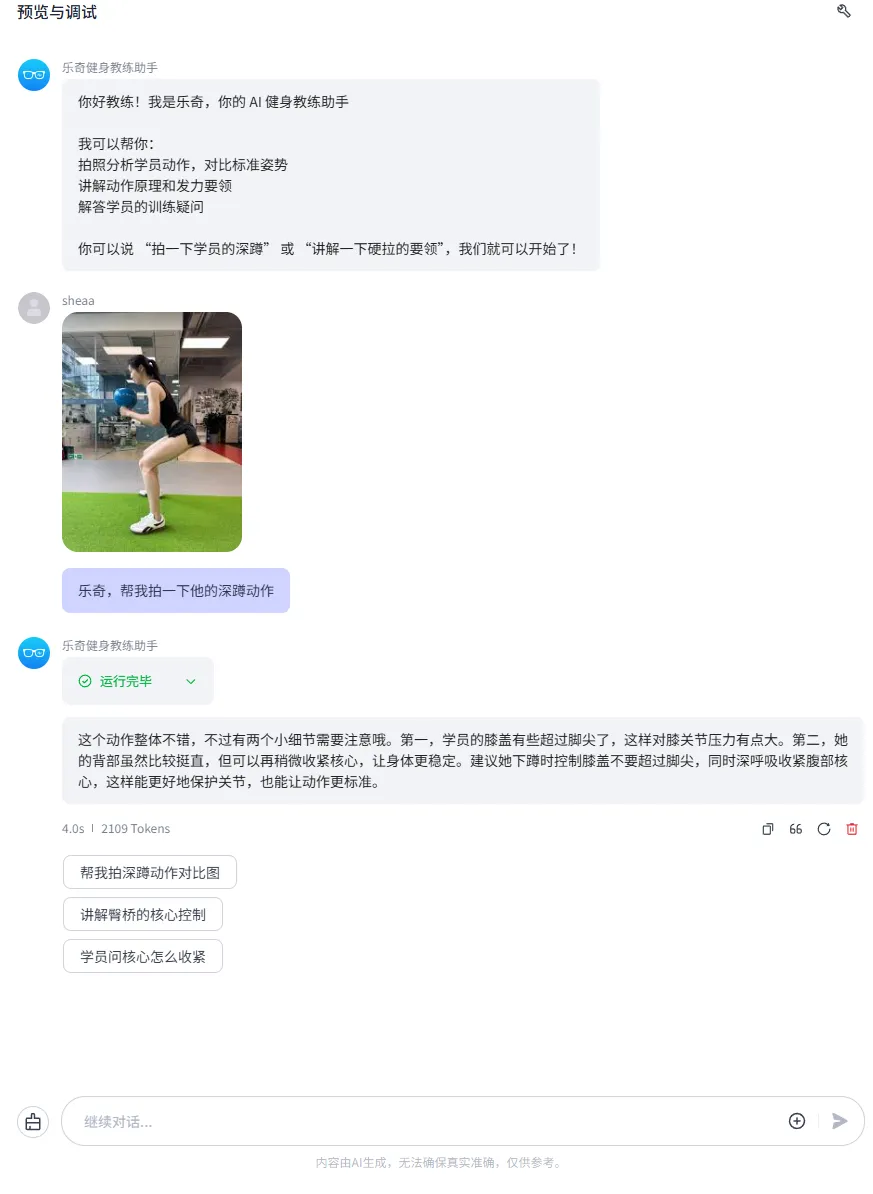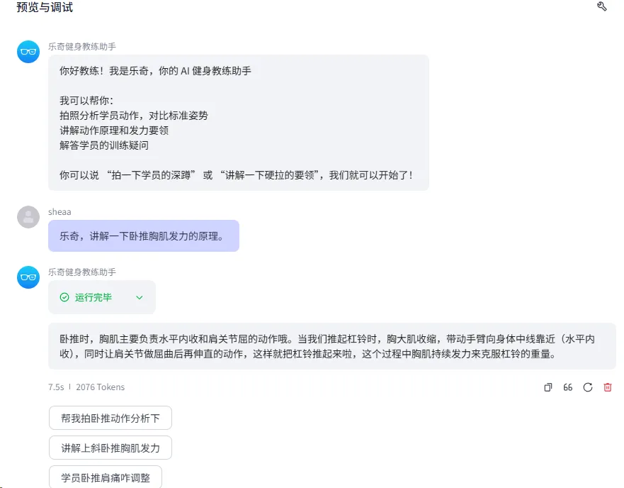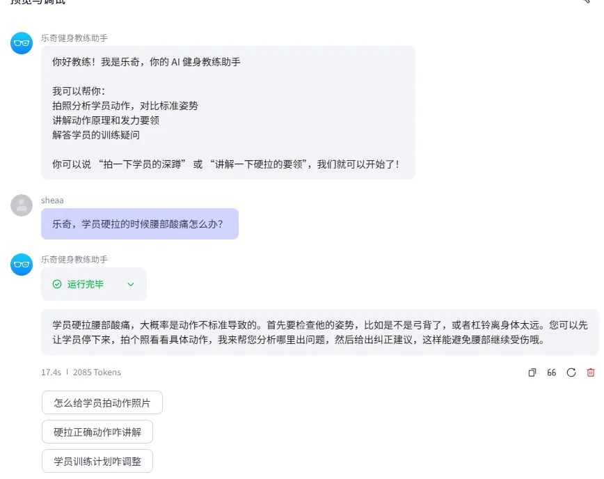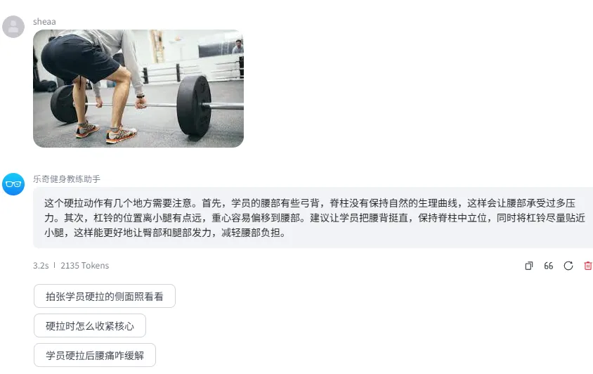 “用户问题建议”功能通过自定义Prompt实现。系统根据当前对话主题,动态生成3条后续问题供教练选择。例如,当教练刚完成深蹲动作分析时,系统会推荐“帮我拍一下硬拉动作”“讲解一下卧推要领”等相关问题。