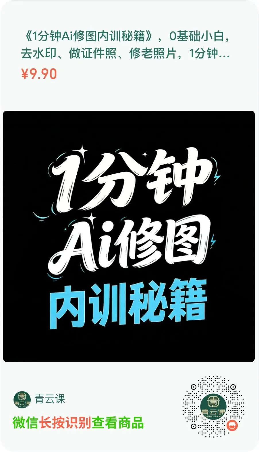 如果只想先尝个鲜,那就拍那个《1分钟AI修图内训秘籍》,只要9块9。这里面是《AI修图18招》里几个核心技巧的提炼,拍了立刻就能用。 -