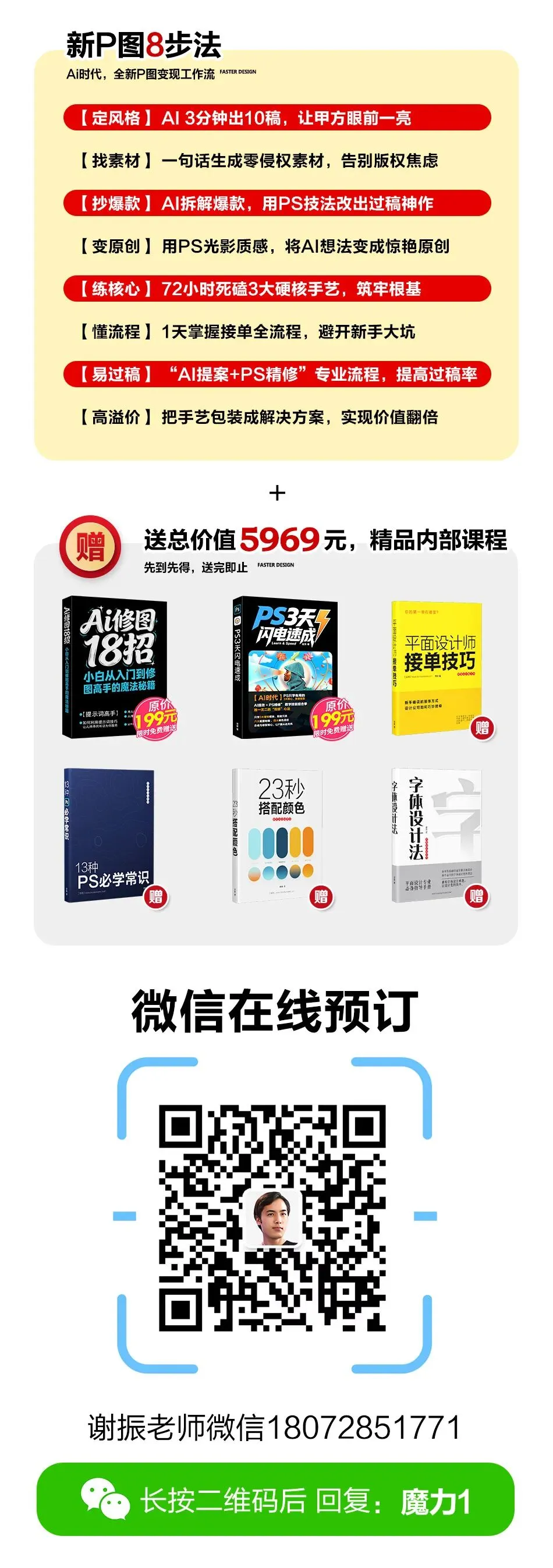《AI修图18招》解决“快”的问题,《PS 3天闪电速成》解决“精”的问题。两门课原价要398,今天一起带走,只要98!我再额外送你超过200套可以直接用的AI修图提示词。