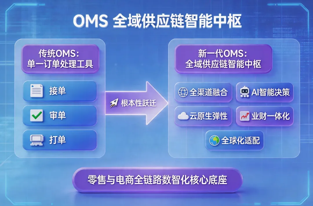 OMS(订单管理系统)正经历从单一订单处理工具到全域供应链智能中枢的根本性跃迁 —— 不再局限于接单、审单、打单等基础执行,而是以全渠道融合、AI 智能决策、云原生弹性、业财一体化、全球化适配为核心方向,成为支撑零售与电商全链路数智化的核心底座。
