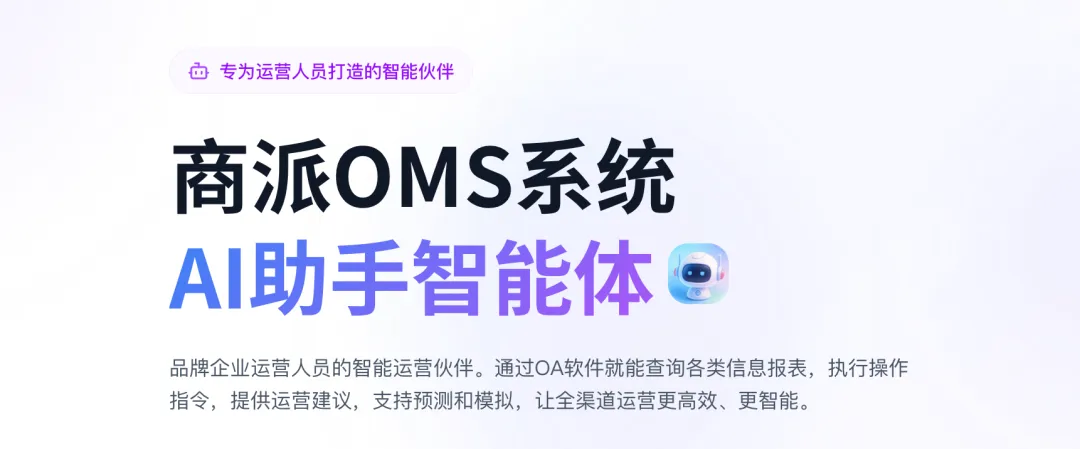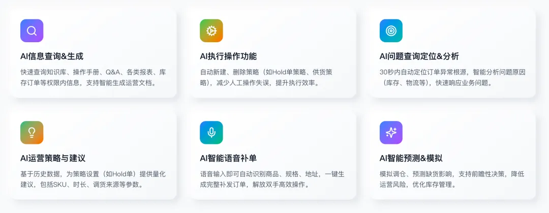 全流程智能自动化:AI 驱动自动审单、异常拦截、智能拆合单、自动打单、智能分仓、售后自动审核、风控预警(如刷单、异常订单、库存风险),替代 80% 以上人工操作;结合 AI Agent,实现智能运维、异常根因分析、运营策略自优化,从被动处理转向主动预警与预测性调度。