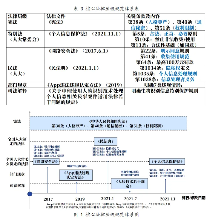 部门规章与司法解释承担着宪法实施的技术细化功能。《APP违法违规收集使用个人信息行为认定方法》将“未公开收集规则”“过度收集”等抽象标准予以具体化,其规范目的在于落实《宪法》第38条对人格尊严的保护,为行政执法提供明确的操作指引。最高人民法院《关于审理使用人脸识别技术处理个人信息相关民事案件适用法律若干问题的规定》则通过“单独同意”“禁止唯一验证方式”等规则设计,将宪法人格尊严转化为可操作的裁判标准。