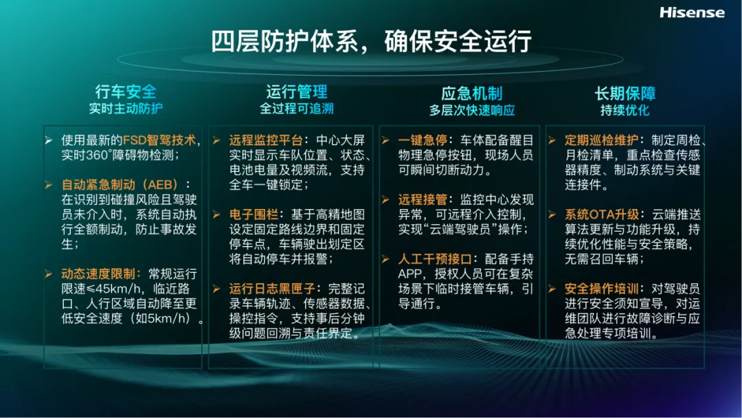 在安全机制上,海信无人车构建了四层防护体系:行车层面采用FSD智驾技术与自动紧急制动;管理层面通过电子围栏、远程监控、运行日志黑匣子等实现可回溯可追责;应急层面支持远程一键锁定;长期层面,海信还提供定期巡检与OTA升级,为无人车在城市道路环境中的合法、合规、安全运行提供了坚实保障。