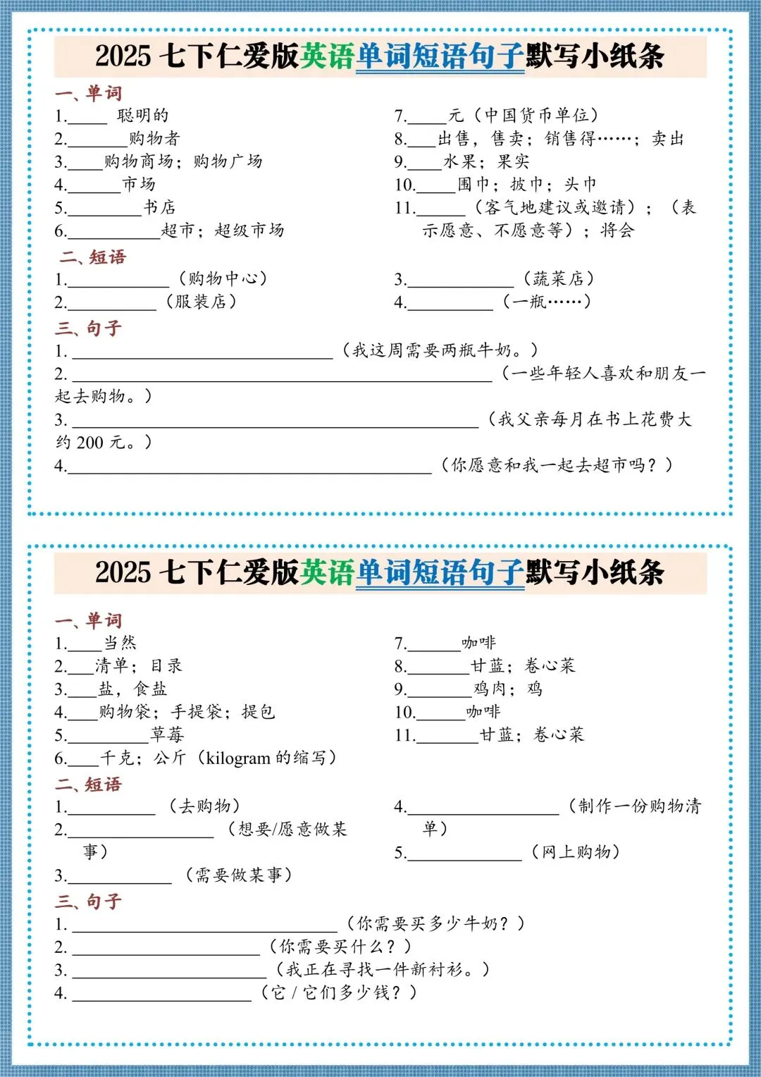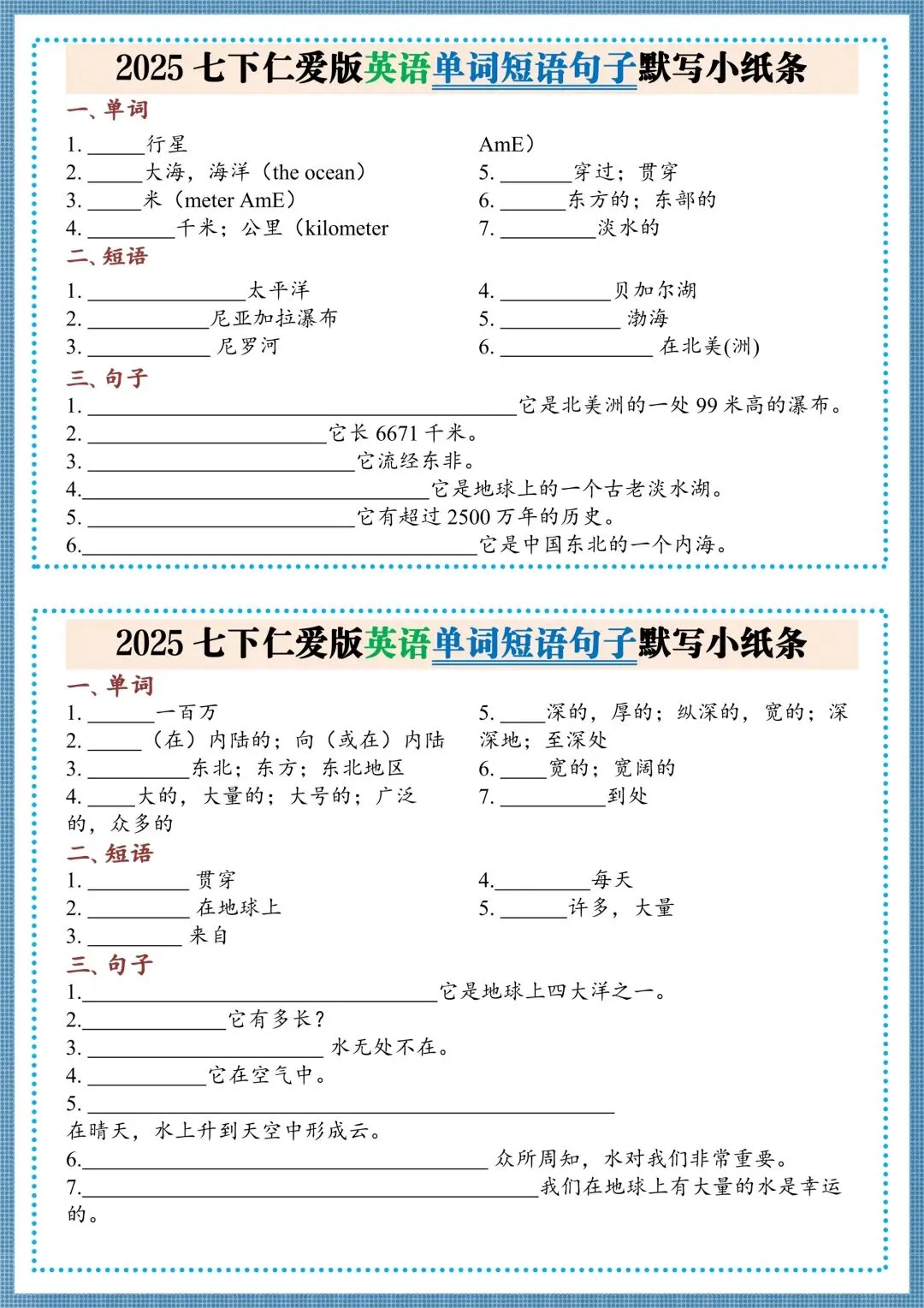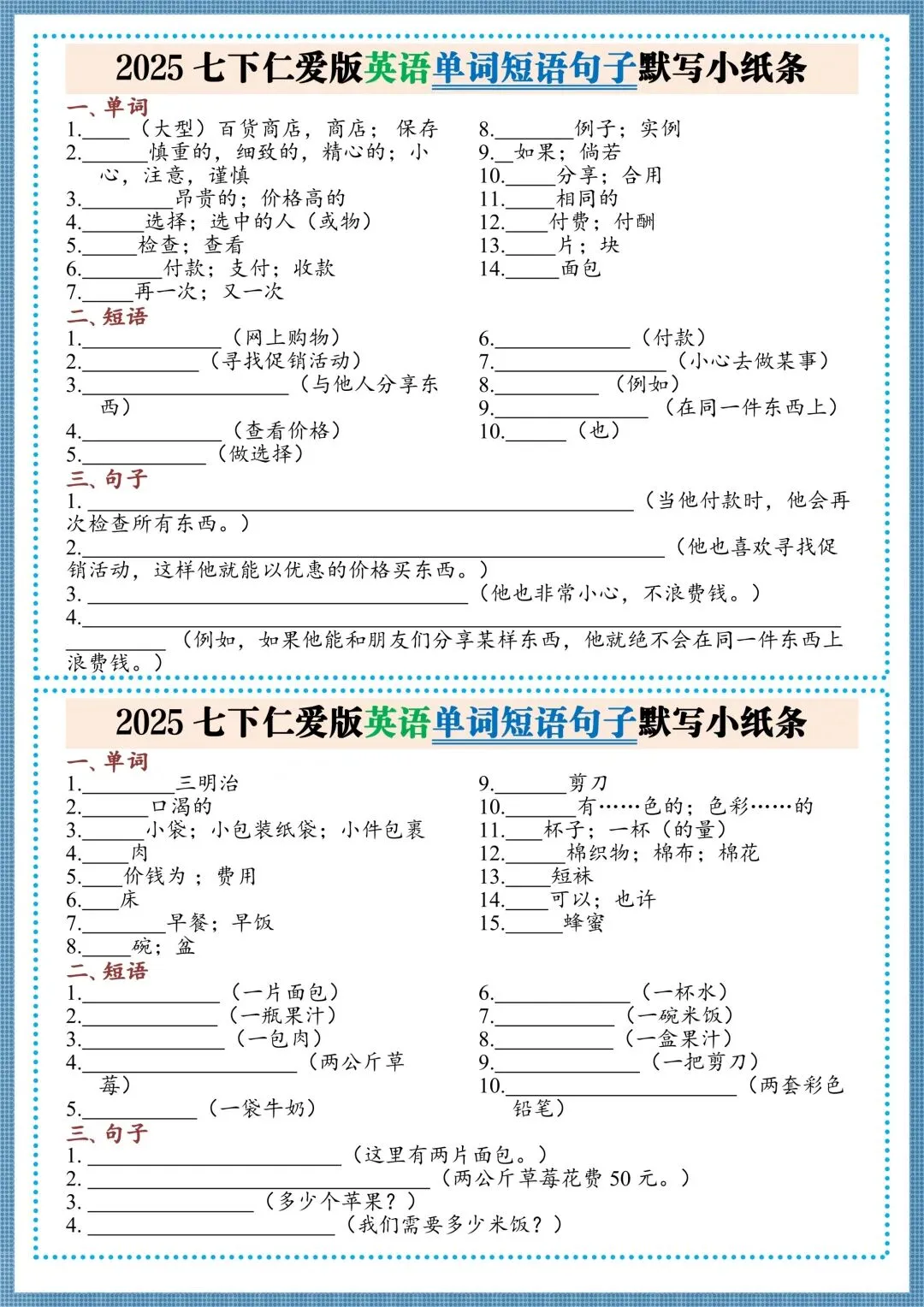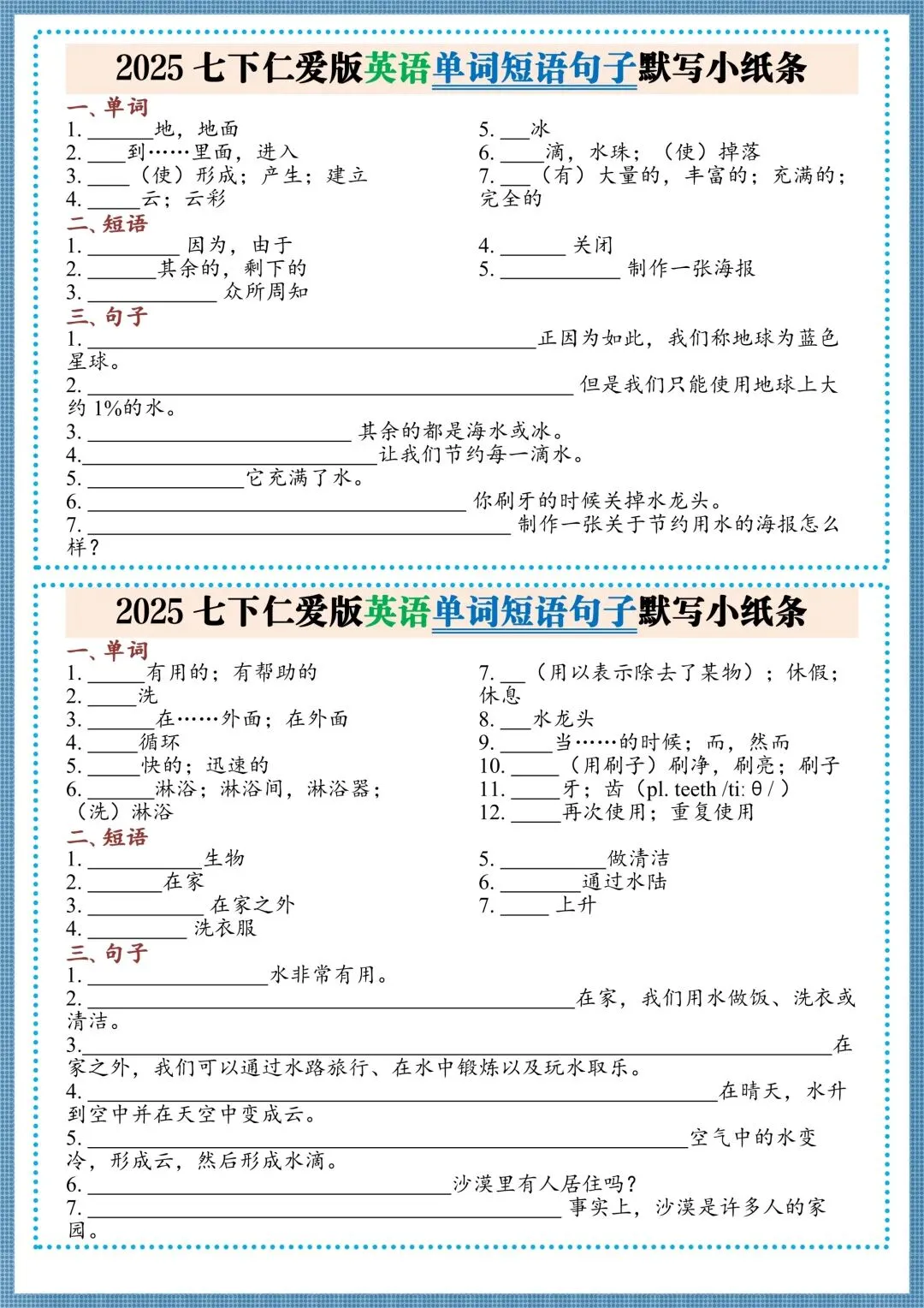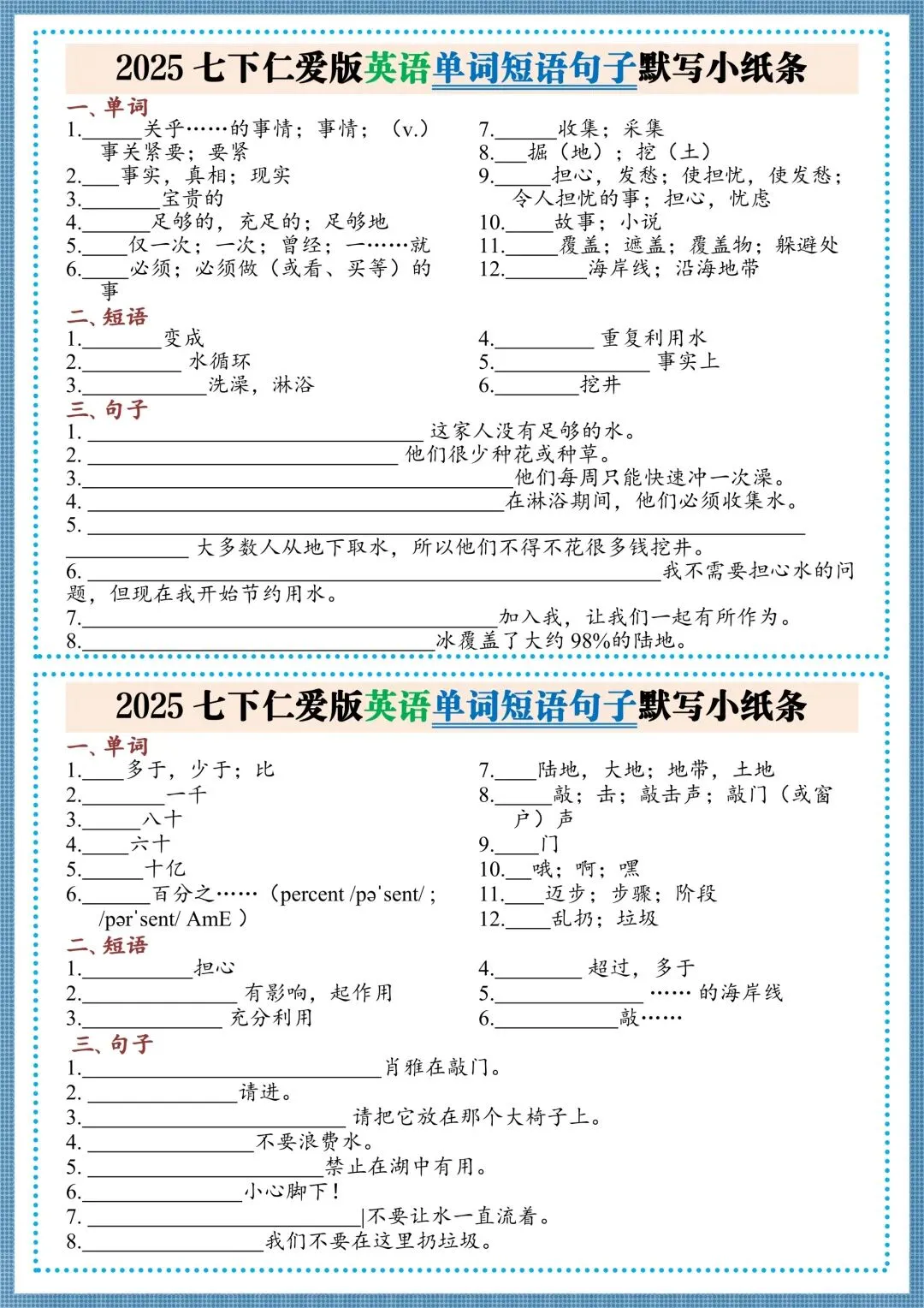 2026春(仁爱版)七年级下册英语全册单词、短语、句子(背诵版+默写版),电子版可打印!
