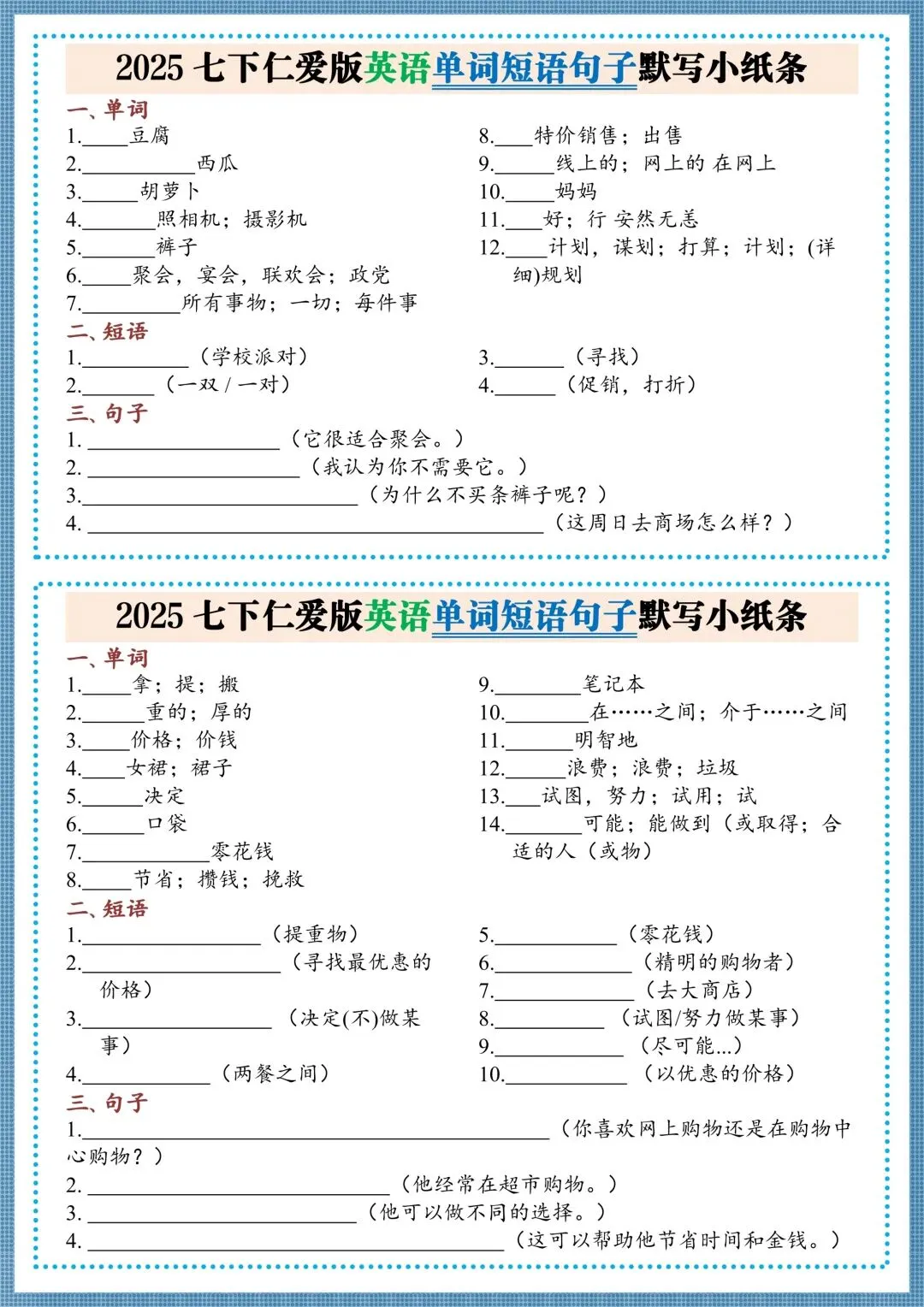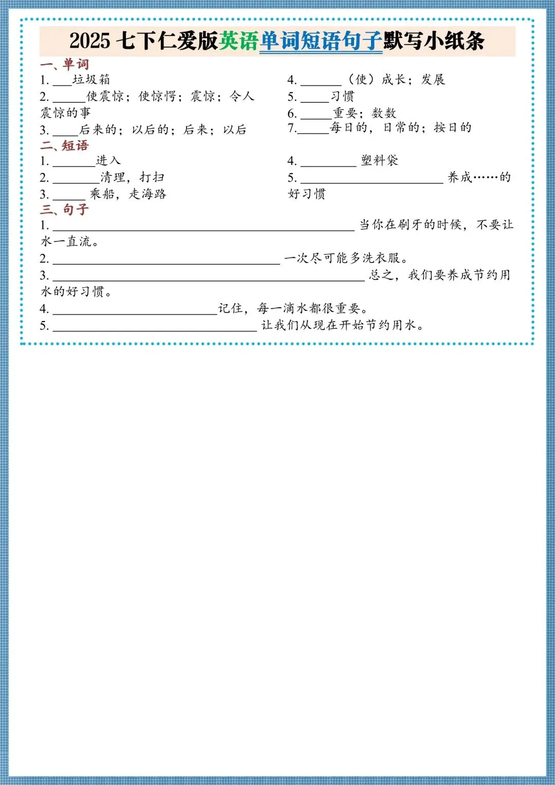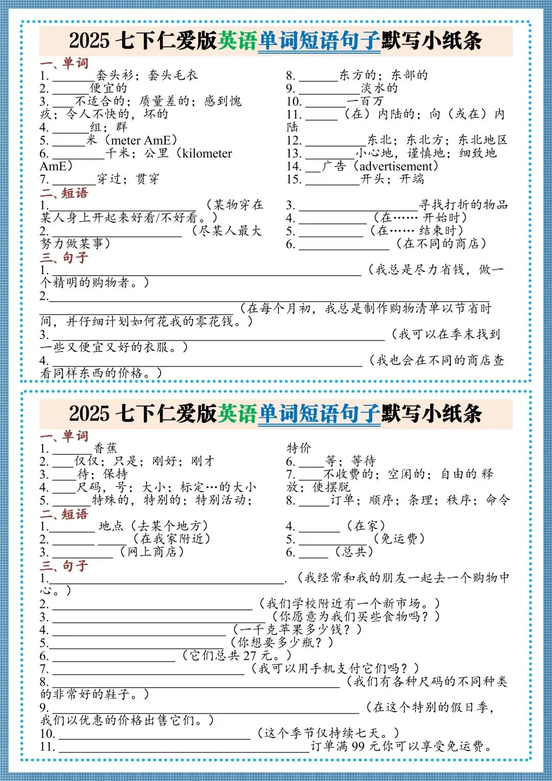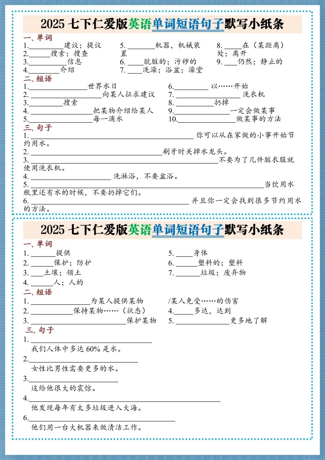 2026春(仁爱版)七年级下册英语全册单词、短语、句子(背诵版+默写版),电子版可打印!