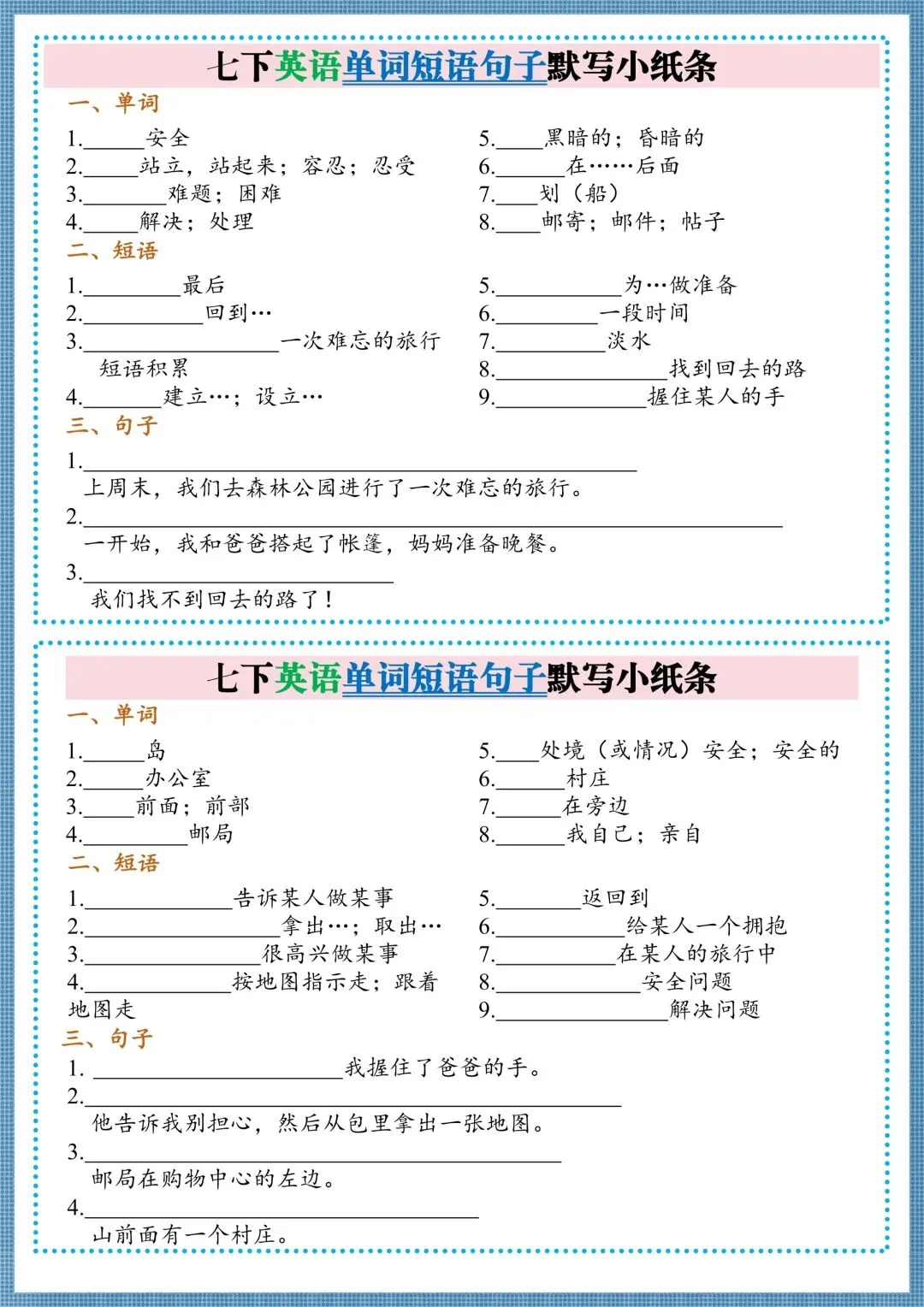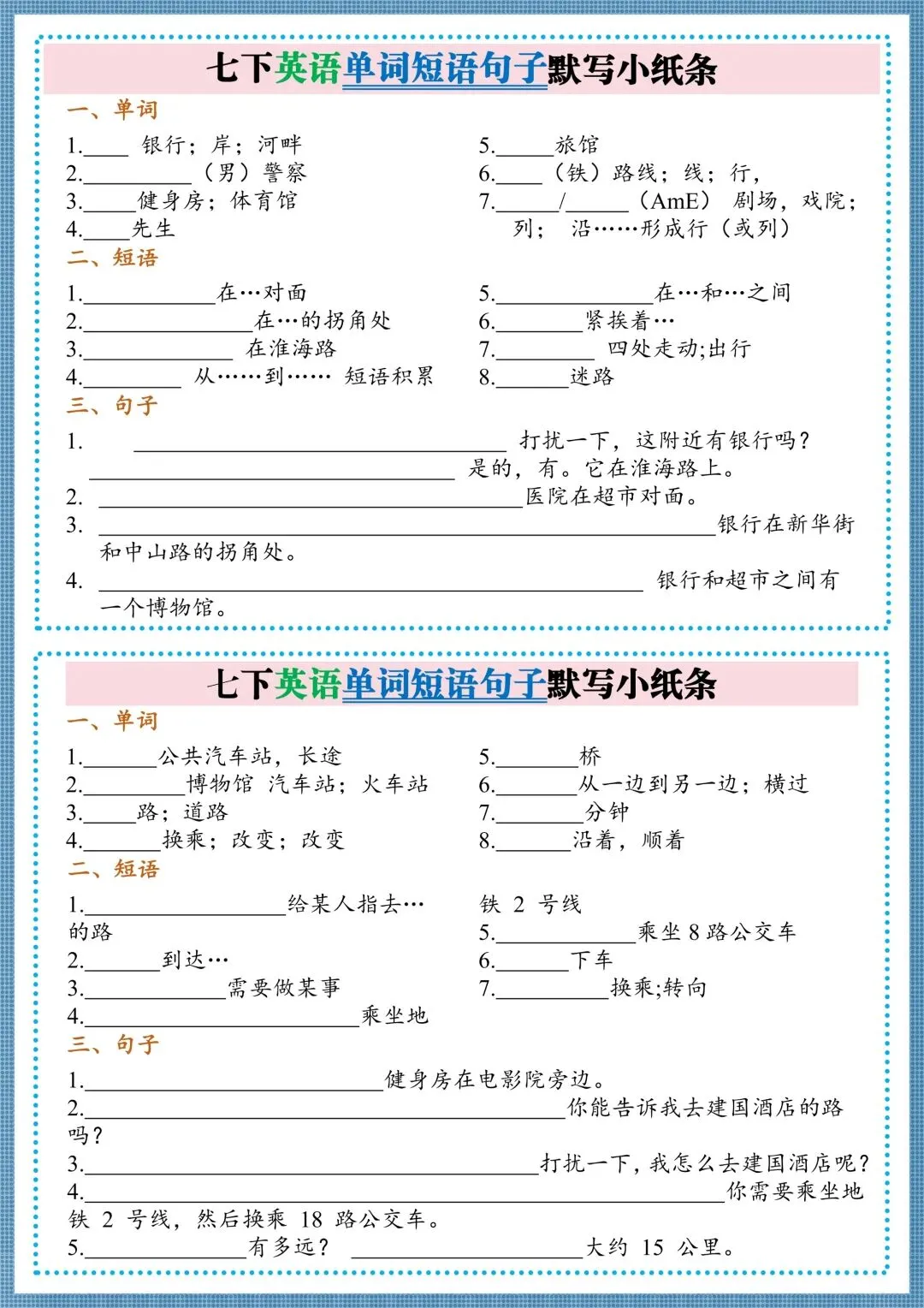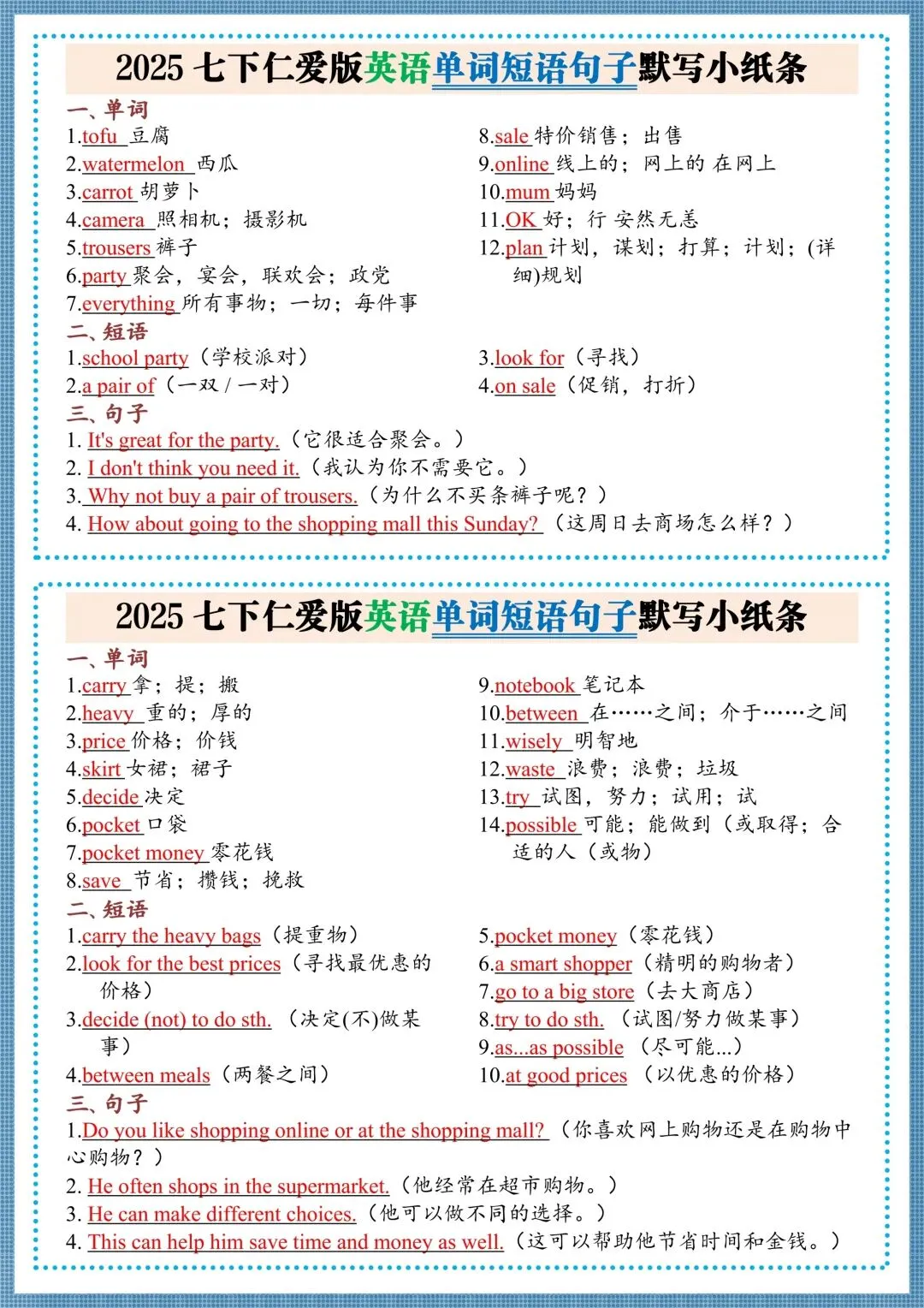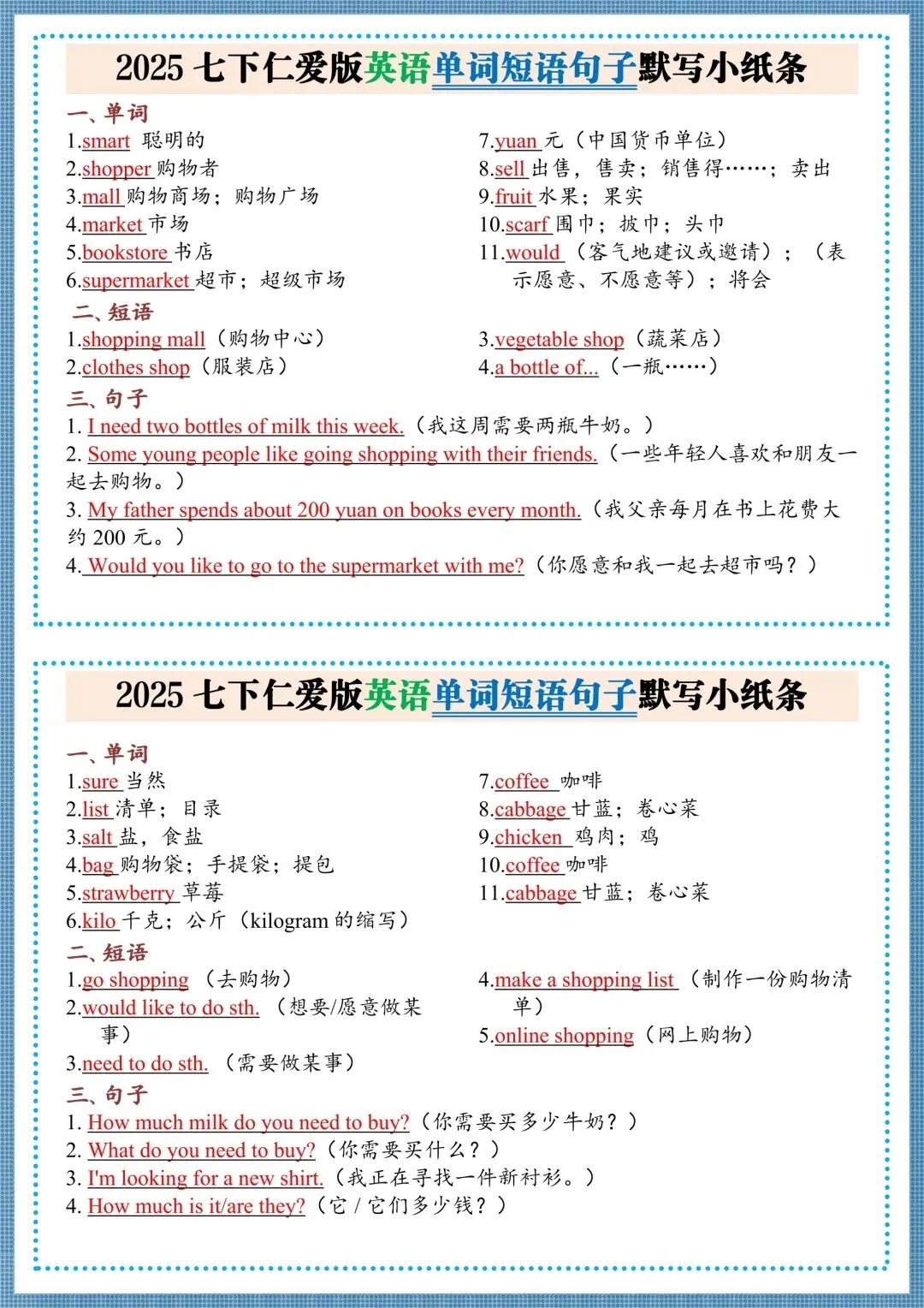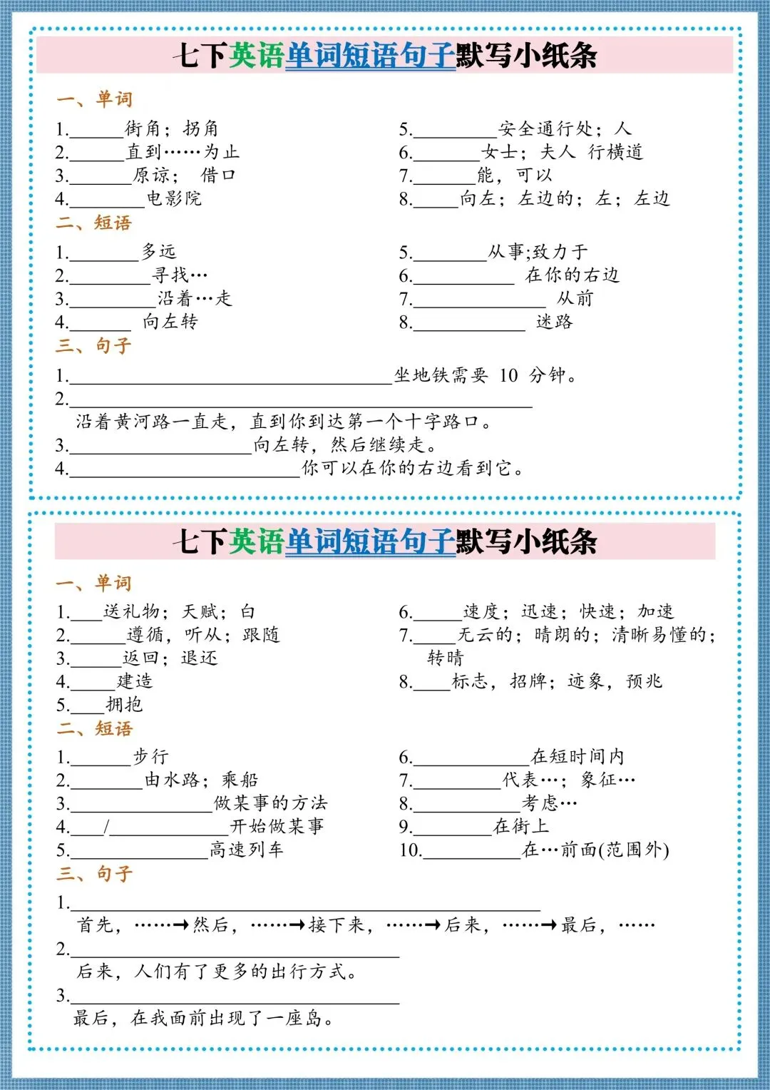 2026春(仁爱版)七年级下册英语全册单词、短语、句子(背诵版+默写版),电子版可打印!
