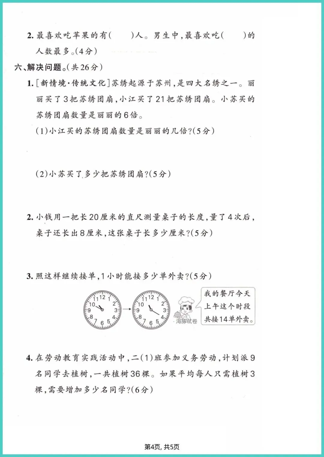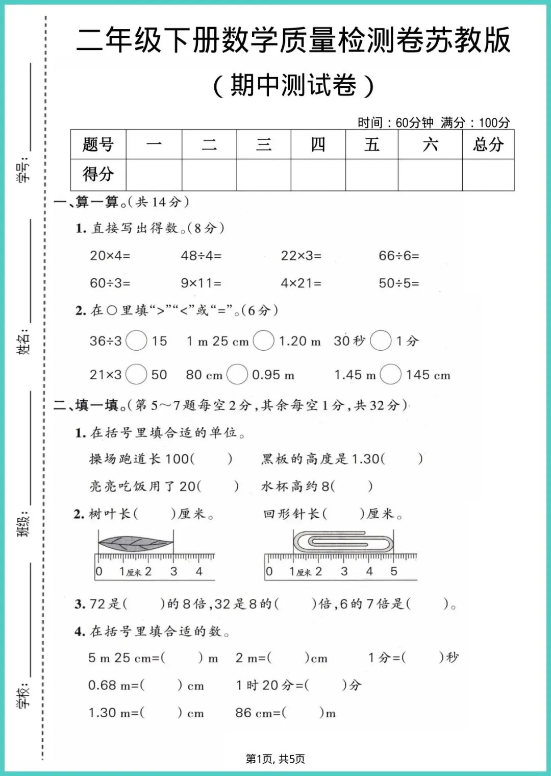 26年春苏教版二年级下册数学期中质量检测卷,5页电子版,一键就能打!精准同步苏教最新课本,囊括计算、应用、图形、思维四大模块,题型由浅入深,期中高频考点全覆盖;附标准答案+评分细则,娃做完即刻自批,错题当场订正,知识漏洞一目了然。每天一页,两周刷完,计算提速、审题更稳、成绩蹭蹭涨!想让孩子期中拿高分,就别等啦,现在就把试卷打印出来,练起来!