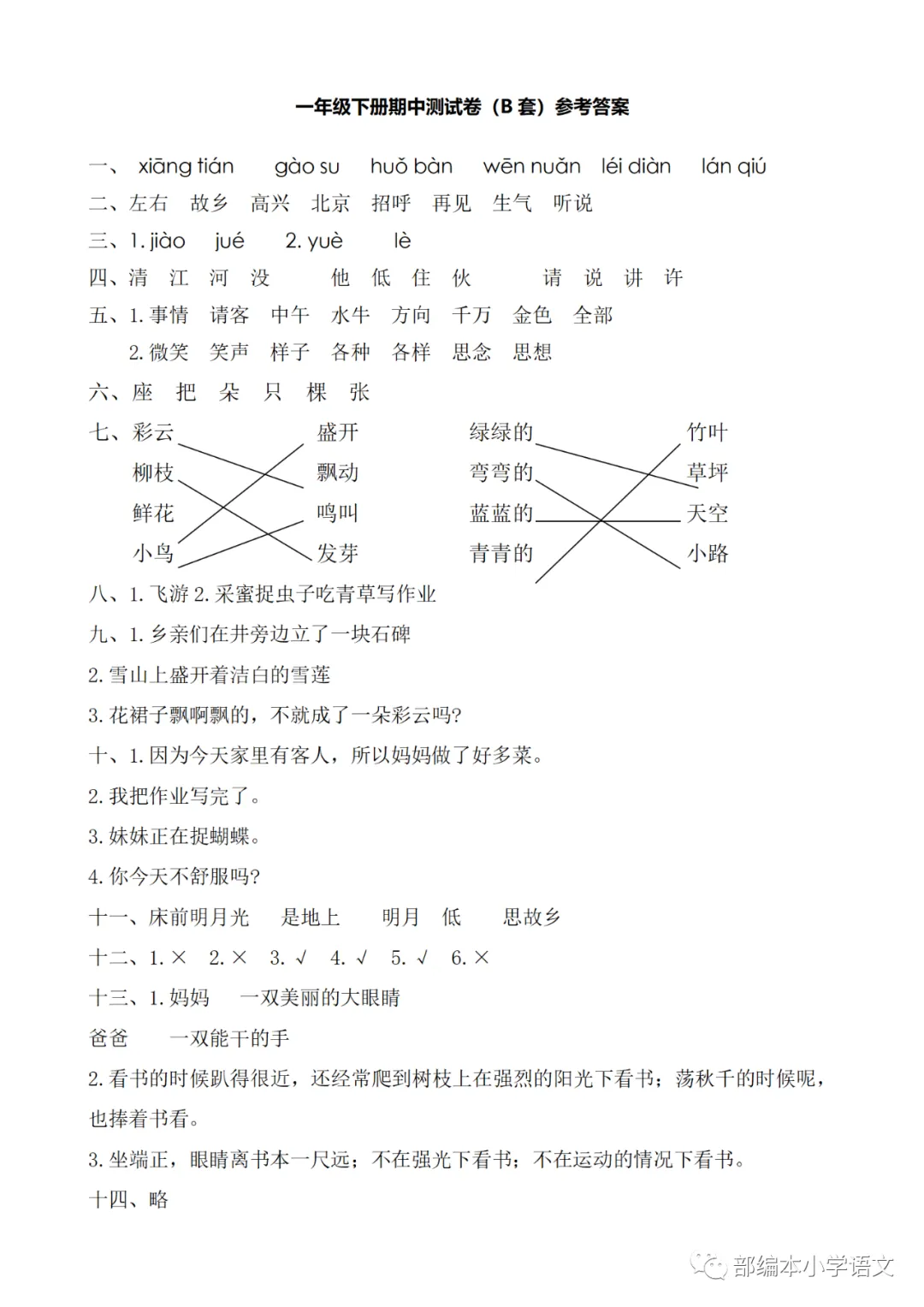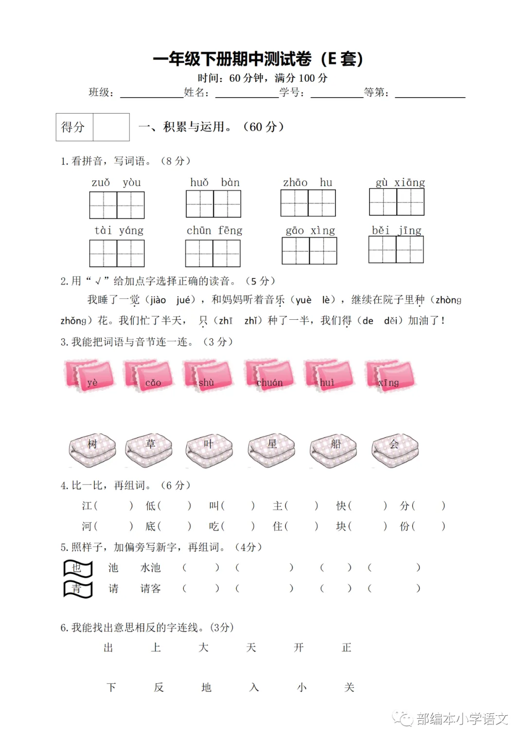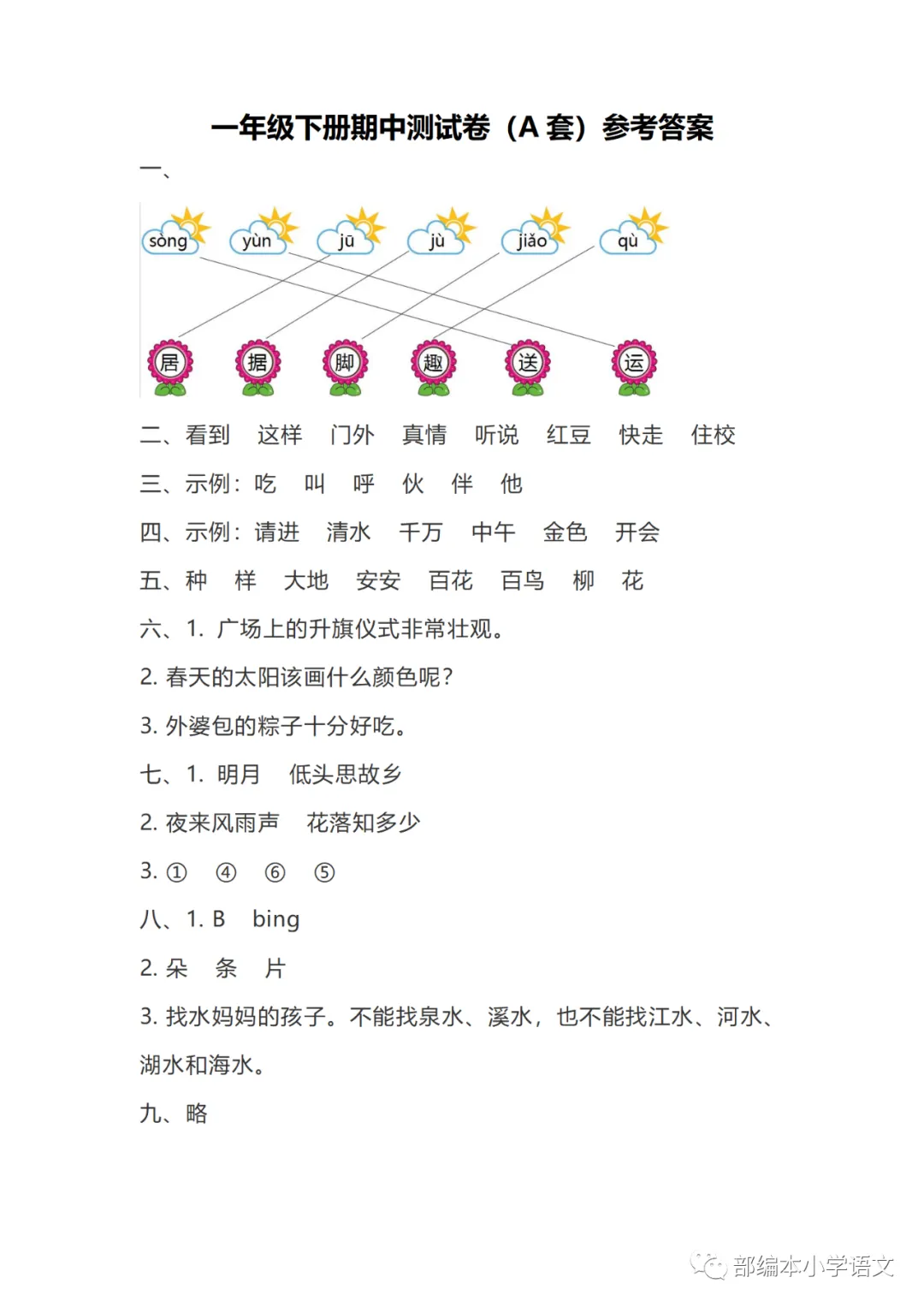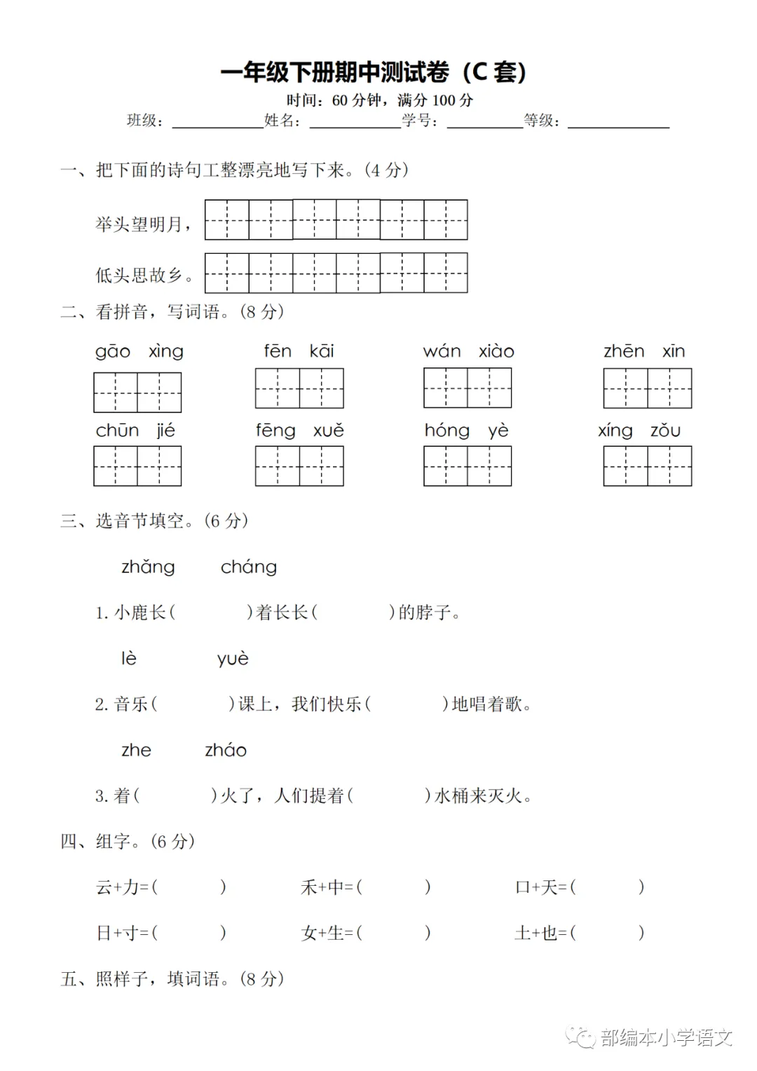 一年级下册期中综合卷5套,免费下载! 课文朗读 微课学习 课件教案 生字字帖 每课一练 必背内容 课文划重点 课堂笔记 晨读晚背 温馨提示:保存图片打印或拉到文末下载电子版 01 02 03 04 05 声明:本公众号尊重原创,素材来源网络,好的内容值得分享,如有侵权请联系删除。更多资料请点击“中小学各学科上下册空中课堂、微课汇总”。 ▼ 期中资料复习 部编语文一(下)期中检测卷① 部编语文一(下)期中检测卷② 部编语文一(下)期中检测卷③ 部编语文一(下)期中检测卷④ 部编语文一(下)期中检测卷⑤ 部编语文一(下)期中检测卷⑥ 一(下)期中字词句专项复习检测卷 一(下)期中必考文学常识 一(下)期中必考基础知识积累与应用 一(下)期中必考综合复习专项 下载电子版方式 ▲扫码关注部编本小学语文 在公众号消息框(后台) 回复:试卷练习 资料下载视频讲解(点击观看) ↓↓↓ 点击下方『阅读原文』一年级下册语文资料合集