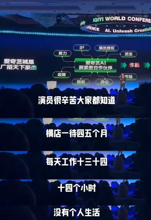 4月20日,爱奇艺通过世界大会高调推出”纳逗Pro”AI艺人库,宣布已有超百位艺人”签约入驻”,展示名单包括张若昀、于和伟、王楚然、李一桐等多位当红艺人。同时,CEO龚宇在演讲中抛出”“AI能让演员一年拍14部戏且休息更多””未来真人实拍可能会成为非物质文化遗产”等争议性言论,被网友讽刺为资本话术与物理规律相悖的荒谬逻辑。