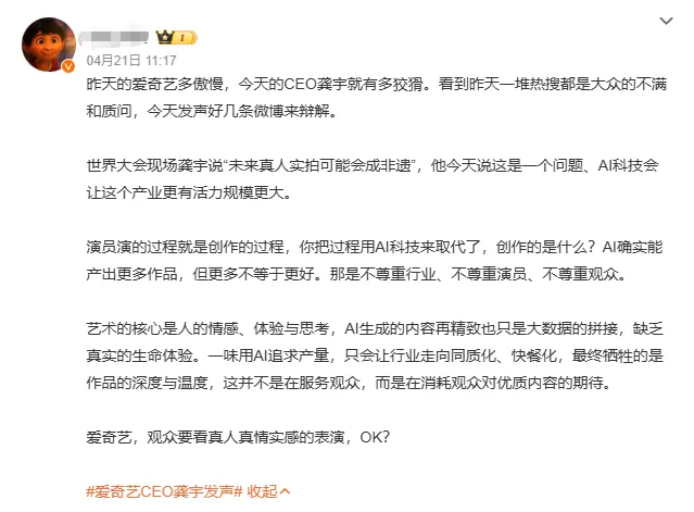 风波持续发酵后,龚宇本人更是连发多条内容辩解,反复强调 AI 只是辅助工具、科技以人为本、绝不会取代真人。