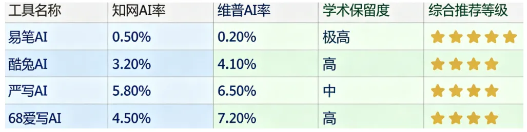 本科/MBA(红线在20%): 首选酷兔AI或严写AI。操作极简,快速降到安全线,性价比出色。