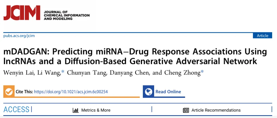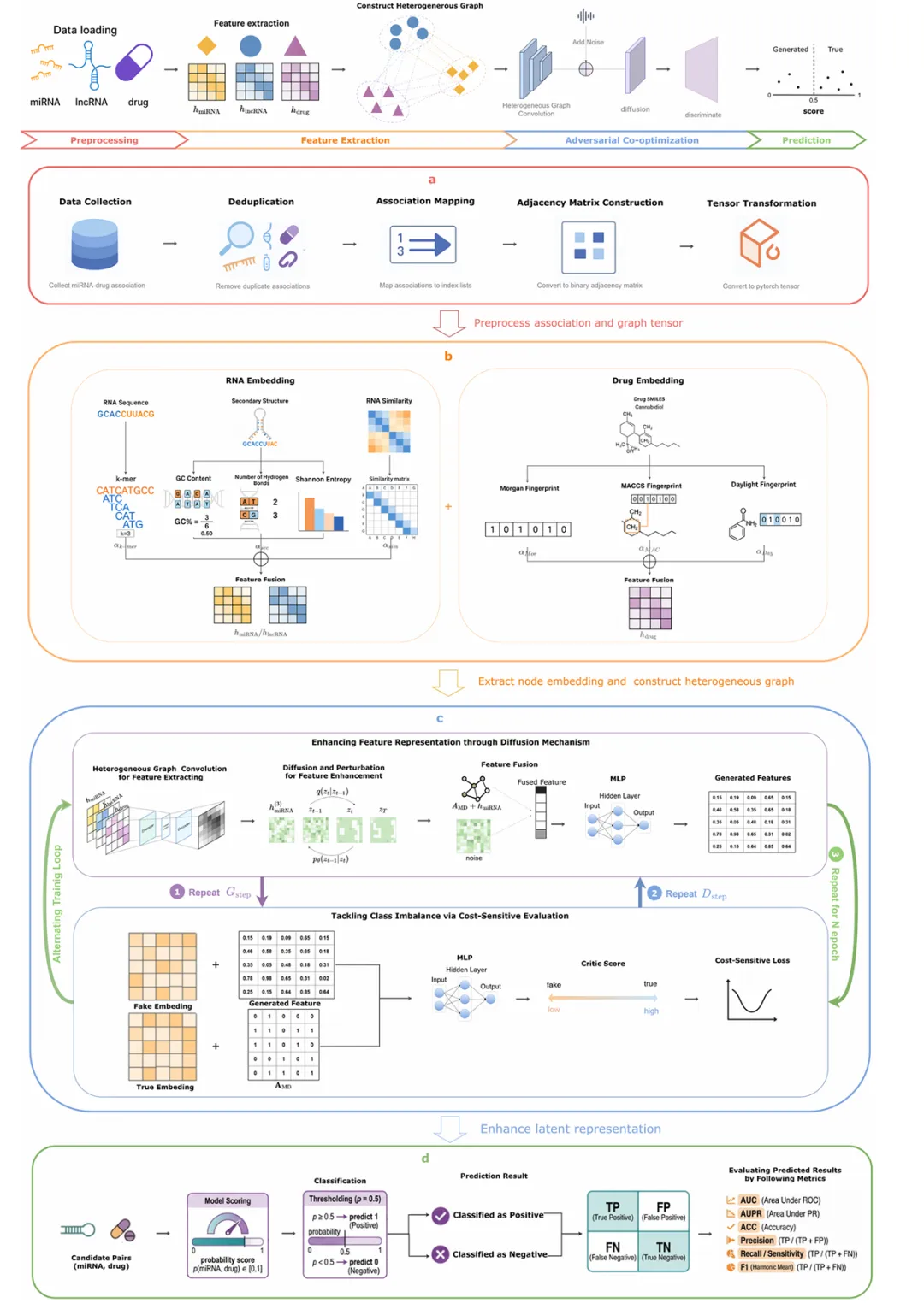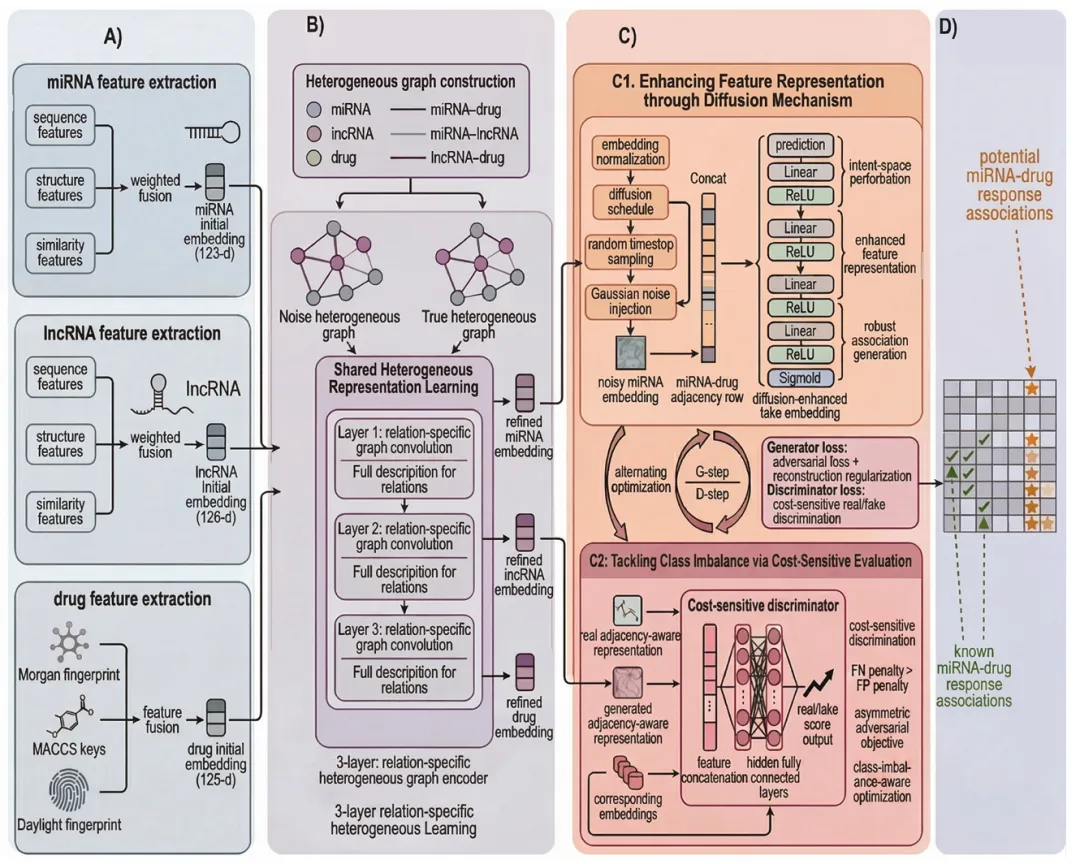 欢迎课题组投稿中文宣传稿,投稿方式见文末mDADGAN:利用lncRNA和基于扩散的生成对抗网络预测miRNA与药物反应关联论文信息广西大学Li Wang、Cheng Zhong团队针对现有miRNA-药物反应关联预测方法难以充分捕获复杂高阶生物交互作用、且对数据稀疏性与类别不平衡敏感的问题,团队提出了一种名为“mDADGAN”的预测方法。该方法基于扩散机制构建了生成对抗网络,具体实现上:首先从四个公共数据资源中整理出融合功能关联的大规模生物信息数据集;其次通过引入lncRNA构建miRNA-lncRNA-药物三层异质交互网络,并利用异构图卷积提取节点间的潜在特征以缓解数据稀疏性;然后引入基于扩散的扰动机制对特征表征进行去噪与鲁棒性增强;最后在对抗训练过程中采用代价敏感学习优化目标函数,从而有效应对类别不平衡。在四个数据集上的对比实验表明,mDADGAN在AUC、AUPR、ACC、召回率和F1分数上均显著优于现有六种方法;案例研究进一步证实,整合lncRNA信息能有效提升预测性能,不仅能准确识别已知关联,还能预测出有文献证据支持的新关联。该工作为未来生物学实验提供了高效的候选筛选工具,有助于提升实验效率并降低研究成本。研究成果于2026年4月20日以题为“mDADGAN: Predicting miRNA–Drug Response Associations Using lncRNAs and a Diffusion-Based Generative Adversarial Network”发表在《Journal of Chemical Information and Modeling》上。图文解读图1:本文方法的总体框架。图1系统展示了mDADGAN的四阶段流程:首先从miRNA、lncRNA和药物中提取序列、结构及化学指纹等多维特征;继而构建miRNA-lncRNA-药物异质图,通过图卷积学习节点嵌入;然后引入扩散扰动增强嵌入鲁棒性,并通过生成对抗网络与代价敏感学习联合优化;最终输出miRNA-药物反应关联预测。该框架有效整合了多源信息与稀疏图上的对抗学习。图2:mDADGAN算法的流程。图2展示了mDADGAN的算法流程:首先预处理构建miRNA-lncRNA-药物异质图及关联矩阵;然后提取RNA的序列、结构与相似性特征及药物的化学指纹,融合为节点嵌入;接着通过异构图卷积学习高阶表示,加入扩散扰动增强鲁棒性,并采用代价敏感的生成对抗网络进行协同优化(对假阴性施加更高惩罚);最后对miRNA-药物对进行打分预测,输出潜在关联。该流程系统集成了多源特征与稀疏图上的对抗学习。文章小结本文提出mDADGAN,一种基于扩散生成对抗网络的miRNA-药物反应关联预测方法。该方法通过整合多源数据库构建miRNA-lncRNA-药物异质网络,提取序列、结构及化学指纹等多维特征,利用扩散扰动增强嵌入鲁棒性,并采用代价敏感学习缓解类别不平衡。实验表明,mDADGAN在AUC、召回率等指标上显著优于现有六种方法,能有效识别已知及潜在关联。消融实验验证了lncRNA信息、扩散机制与代价敏感学习的核心贡献。案例研究进一步证实其生物学合理性。该框架为药物敏感性筛选和个性化治疗提供了高效计算工具。文献来源DOI:https://doi.org/10.1021/acs.jcim.6c00254