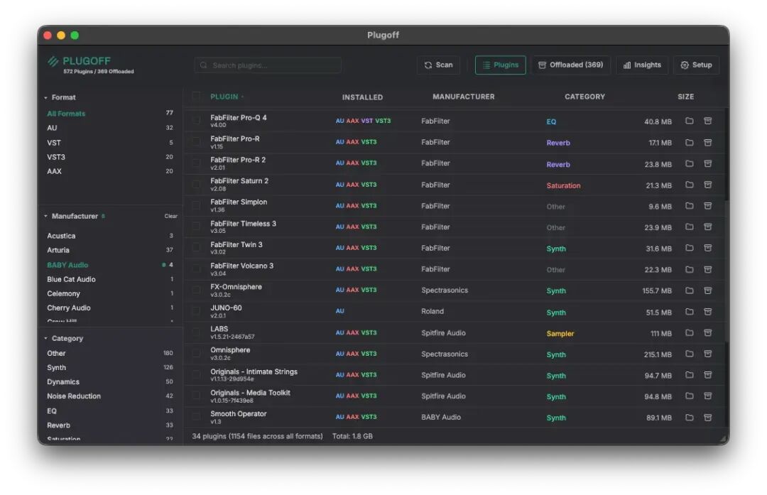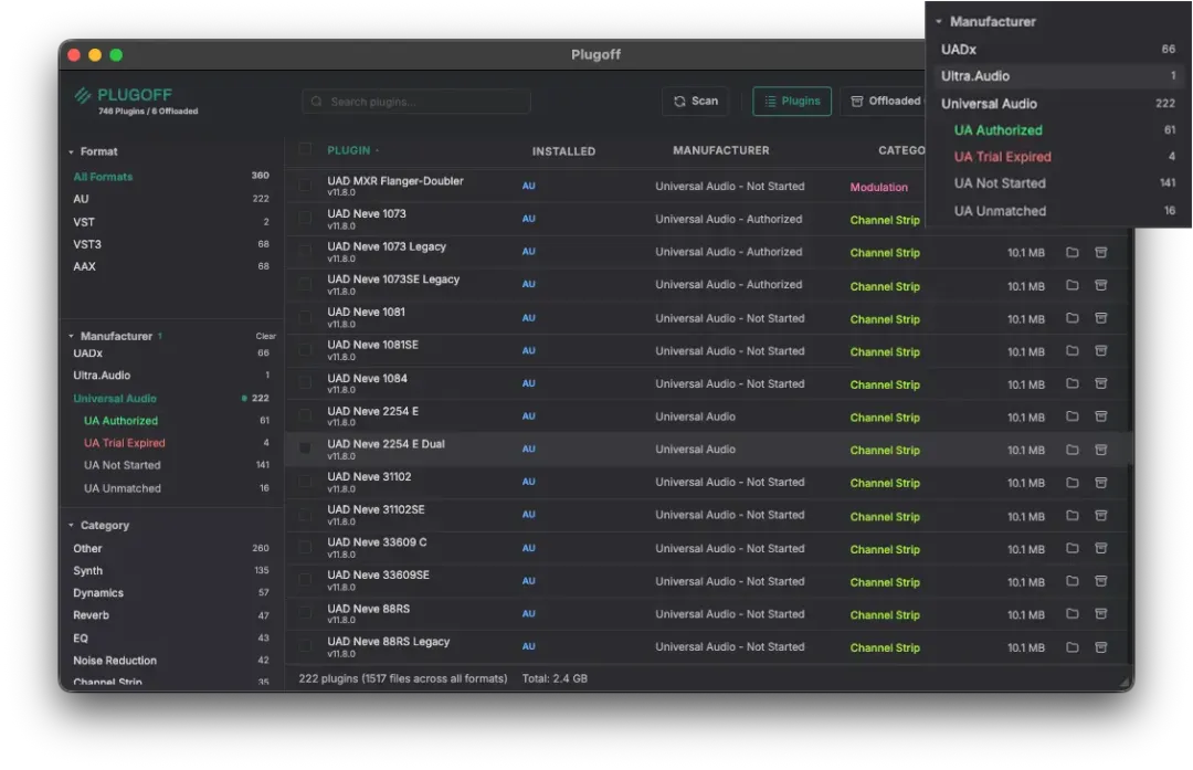 UAD 玩家最痛的未授权、演示版、过期插件,Plugoff 直接按授权状态分类,精准卸载不常用 / 未拥有的插件,列表瞬间干净!