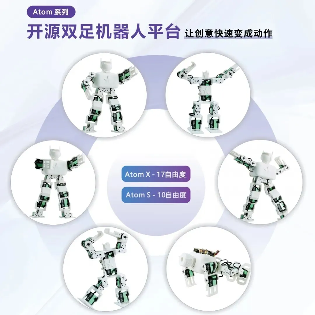 Atom双足机器人采用全3D打印+舵机驱动,Web可视化控制,无需安装上位机即可完成动作编排,支持Raspberry Pi、ESP32等多种主控,适合步态研究、机器人竞赛与创客教育。