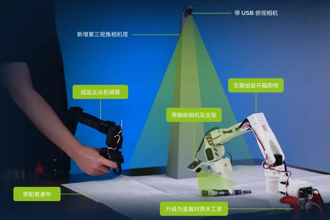 SO-ARM101 3D打印舵机机械臂套件提供“引导臂+跟随臂”遥操作模式,支持ACT、Diffusion Policy、Pi0、NVIDIA GR00T N1等端到端模型,可在真实场景或Isaac Sim中采集数据并部署策略,为高校科研人员提供低门槛的模仿学习验证平台。