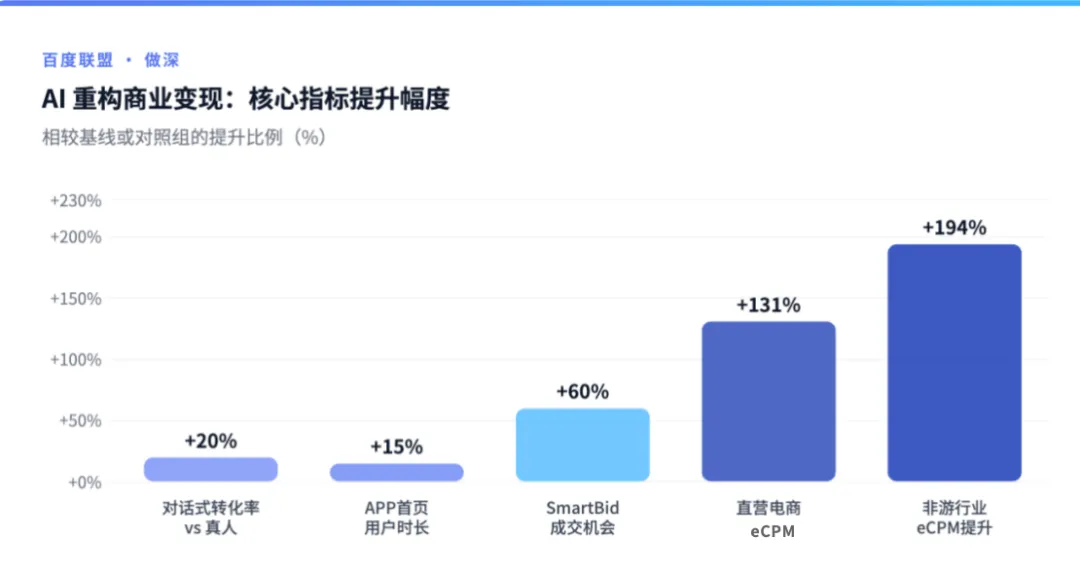 用户行为的重塑,直接催生了广告范式的革命。百度联盟总经理丁宗尧提出的“更智能、更原生、更精细”,背后是一套完整的变现自动化逻辑。AI出价系统可以实时解析人群属性与广告场景,动态生成多模态广告,将创意生产周期从天级压缩至分钟级;商家智能体将传统被动填表转变为7×24小时的对话式服务,转化率比真人客服高出20%;配合原生电商SDK,直营电商eCPM提升了131%。