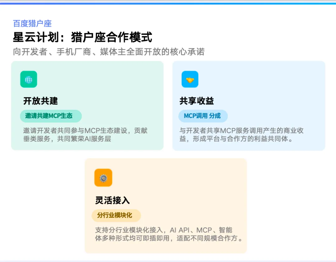 当前,开发者和设备厂商在自建AI助手时,普遍面临三大结构性瓶颈:模型推理成本居高不下(据a16z测算,月活千万级AI助手每月推理成本可轻松破千万元)、增值服务路径模糊、差异化内容生态积累周期过长。针对上述痛点,百度联盟正式启动“星云计划”,将百度猎户座AI引擎向合作伙伴全面开放。