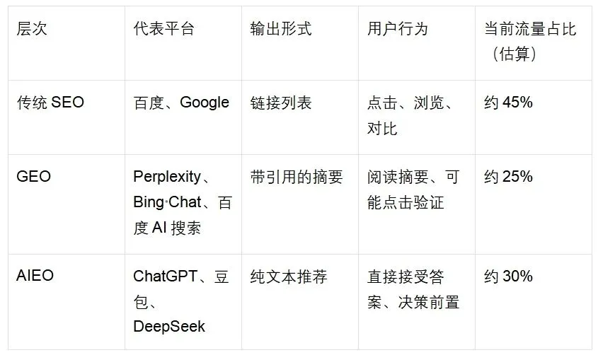1.三层流量入口并存:传统SEO(搜索排名)、GEO(生成式搜索引用)、AIEO(对话式AI推荐)构成当前企业数字营销的三层体系,三者协同而非替代。
