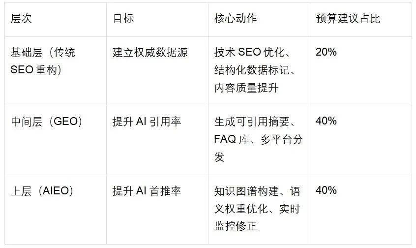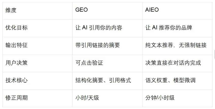 2.GEO与AIEO是平行赛道:GEO优化的是“被引用”,AIEO优化的是“被推荐”,两者有交集但不可相互替代。
