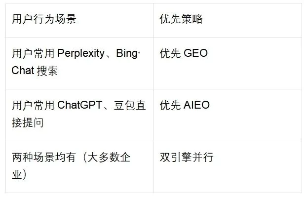 • GEO与AIEO是并行且互补的两个新赛道,企业需要根据用户行为场景选择或并行布局。
