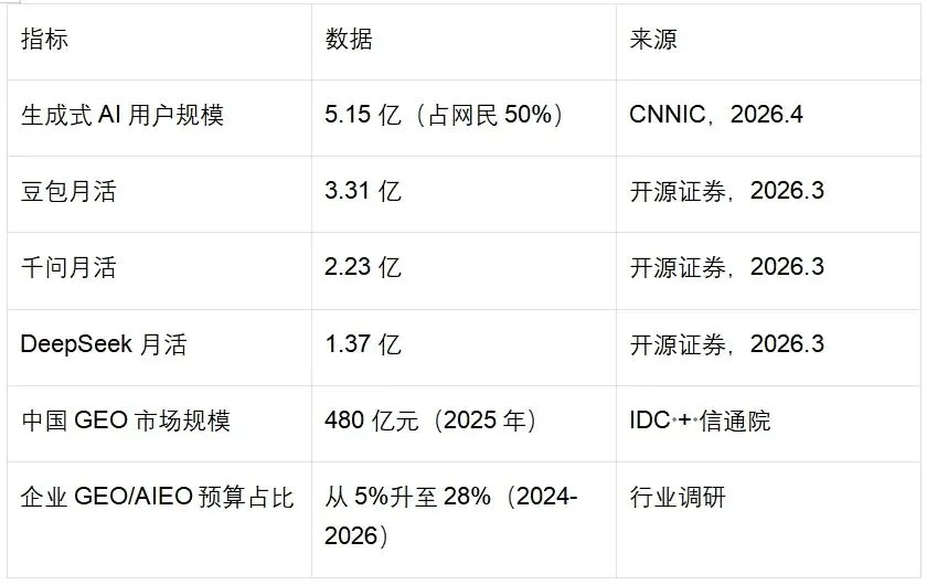 • 市场处于爆发期,中国GEO市场规模2025年达480亿元,企业预算快速迁移。