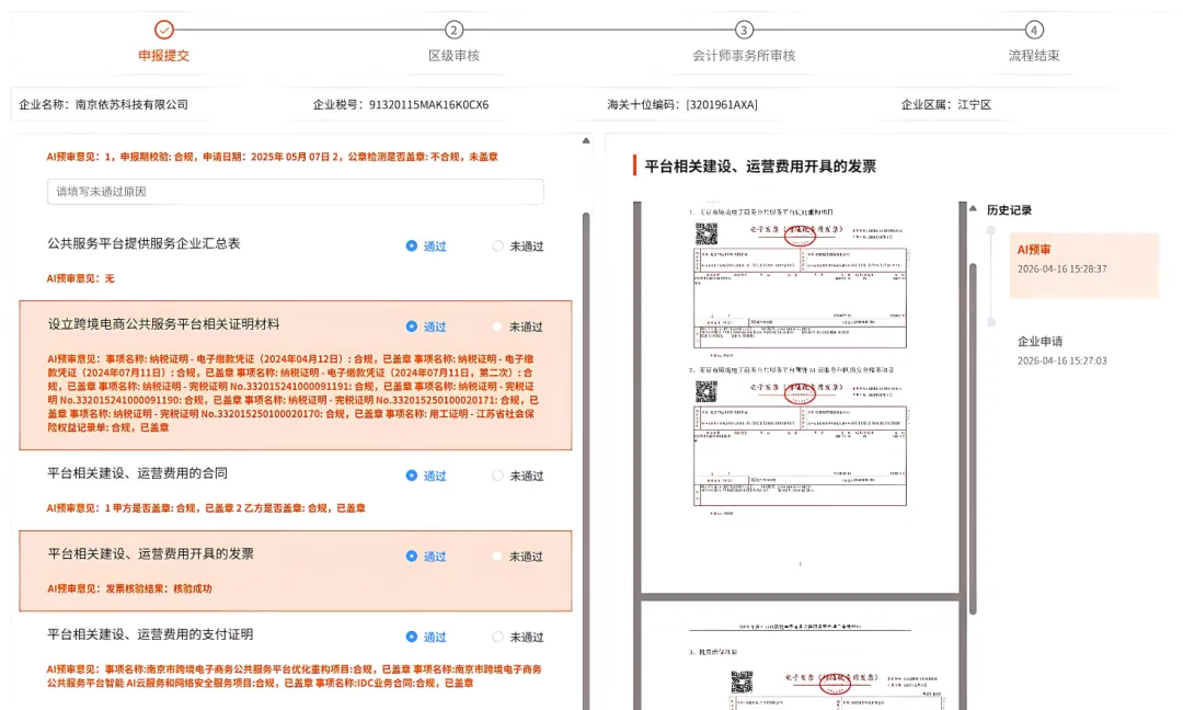 近日,在市交通局、市商务局等部门的指导下,由南京交通物流集团、南京市电子口岸有限公司自主研发的“申报材料AI预审智能体”正式落地,将率先服务于南京区域性航运物流中心多式联运物流信息服务平台(市级物流信息平台)、南京市跨境电商公共服务平台,会陆续在跨境电商项目申报、外贸政策申报、集装箱航线奖励补助、航线企业备案、集装箱重箱奖励等政务申报场景以及专项审计场景中应用。