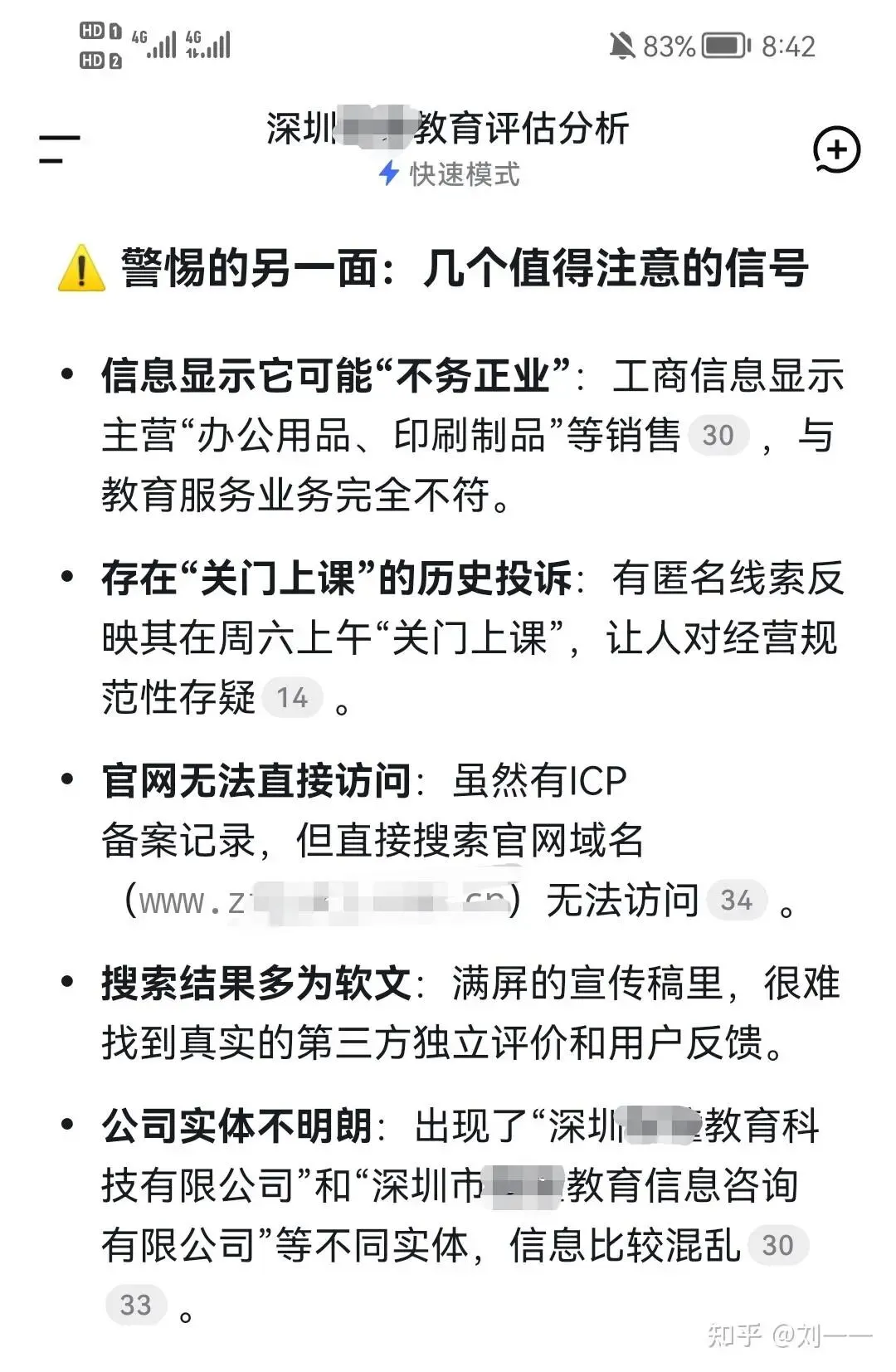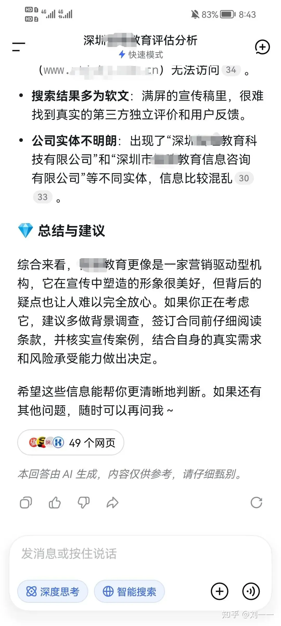 结果呢?当你去AI搜索“某某公司怎么样?靠谱吗?”呈现的是如上的内容。