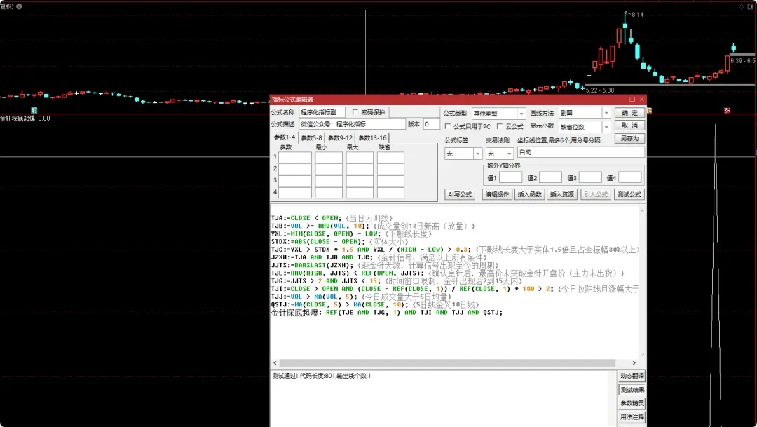 TJC:=YXL > STDX * 1.5 AND YXL / (HIGH – LOW) > 0.3; {下影线长度大于实体1.5倍且占全振幅30%以上}