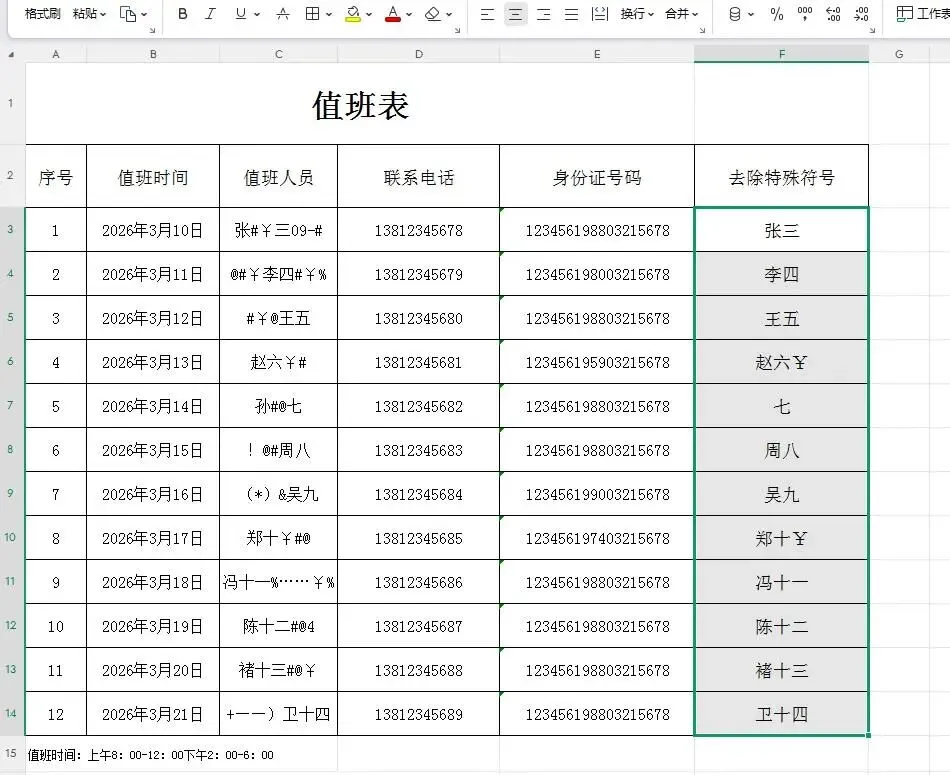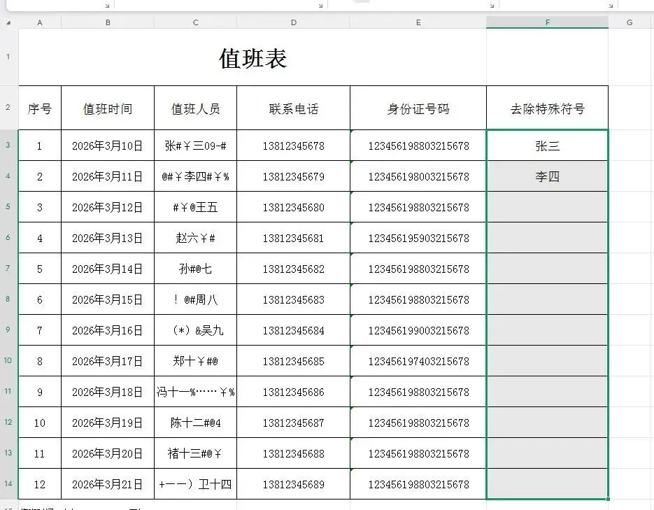 去除特殊符号,如在 张#¥三09-# 中提取 张三 ,这个不太精准,需要多输入两行内容,全选需要提取的所有行,按 Ctrl+E,对错误的数据需要手动修改一下。
