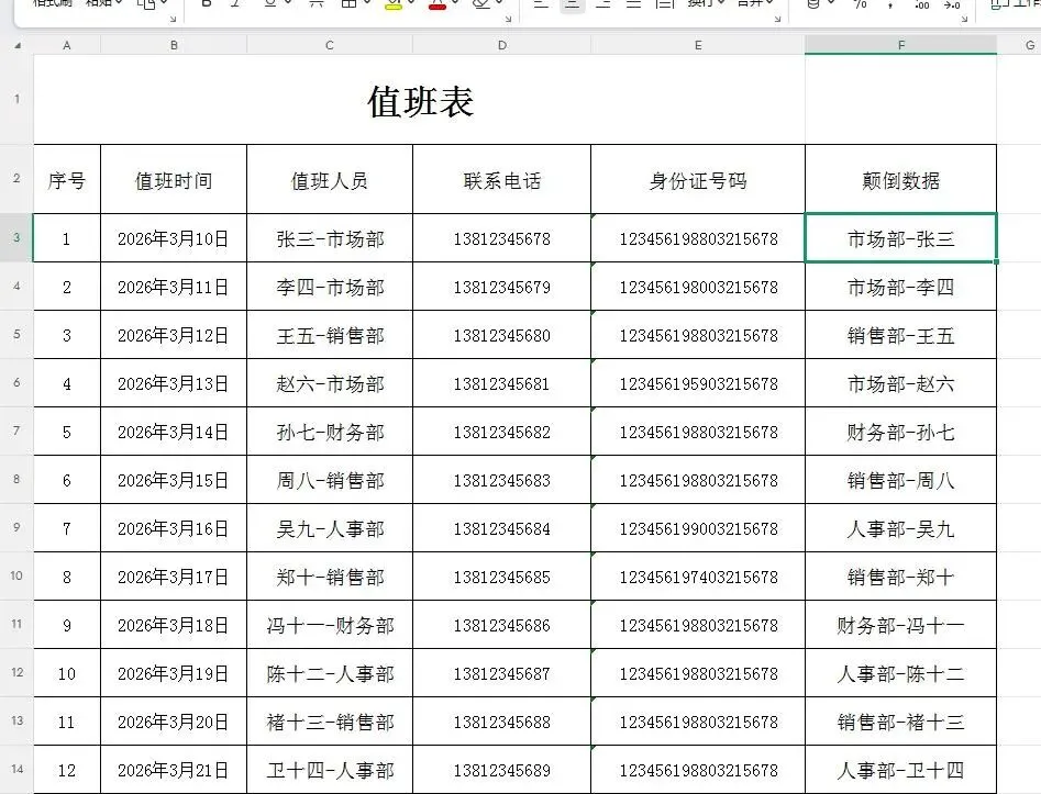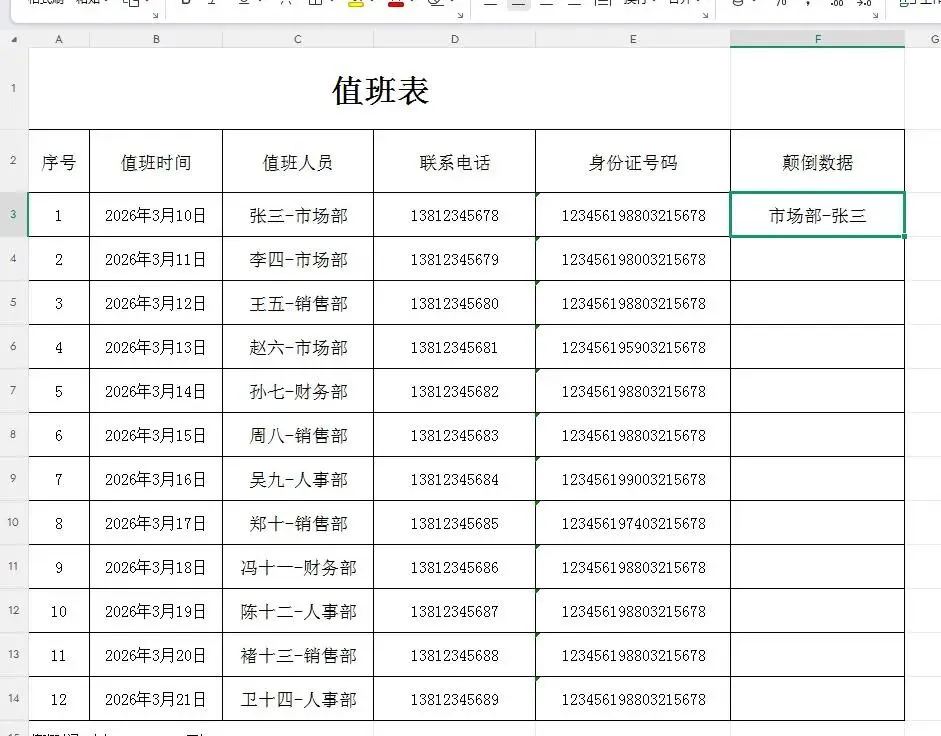 颠倒数据,如将 张三-市场部 变为 市场部-张三