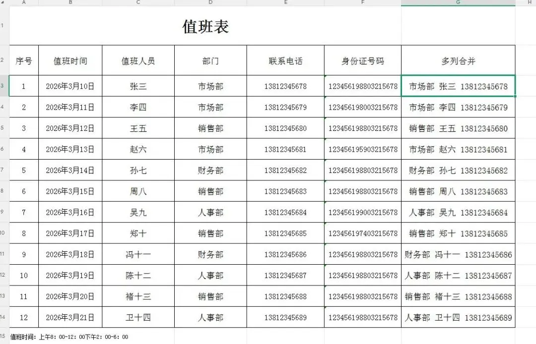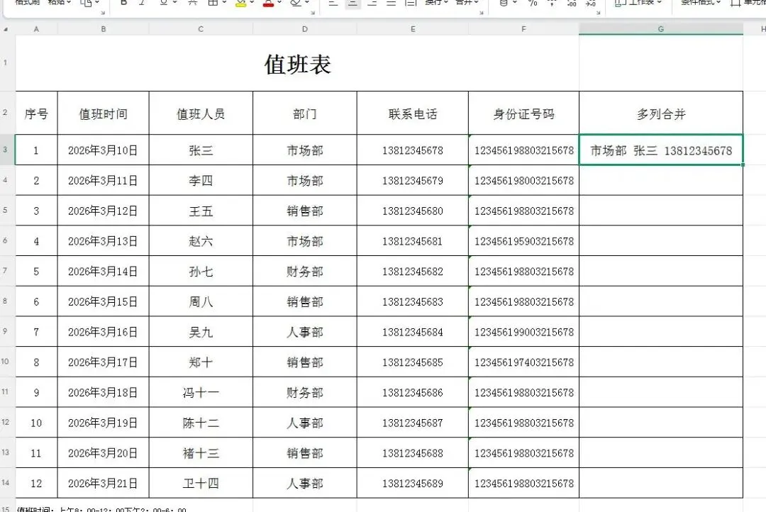 如将D列部门+C列姓名 + E列联系电话合并为一列内容。