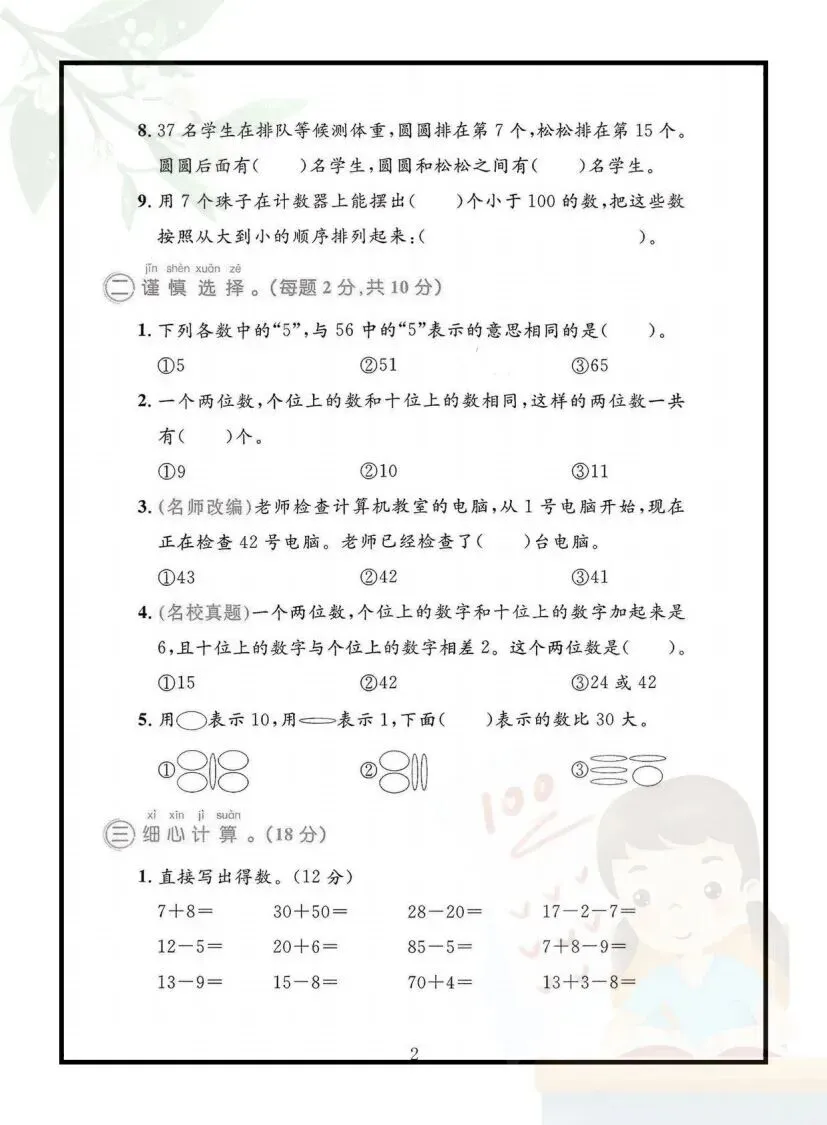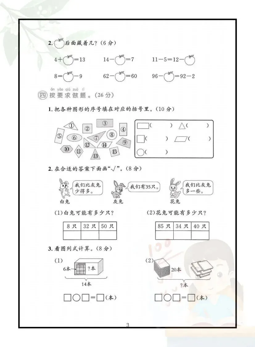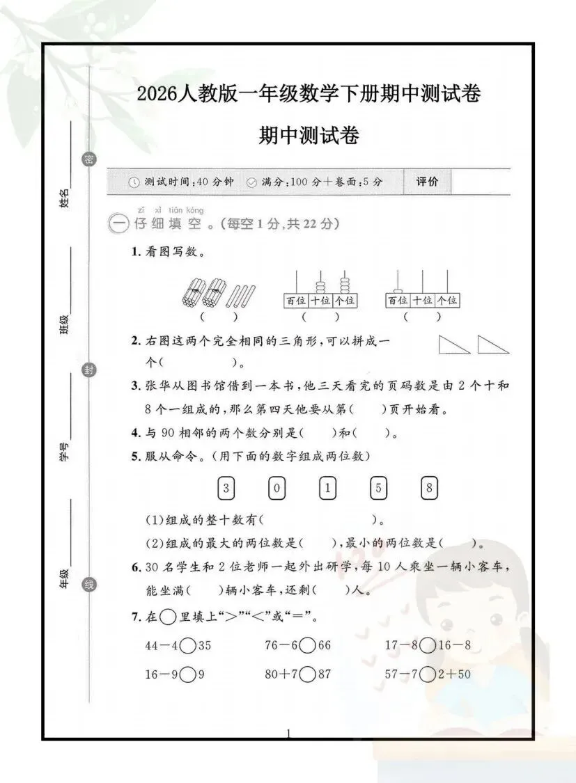 一年级下册数学期中测试卷(电子版可打印)