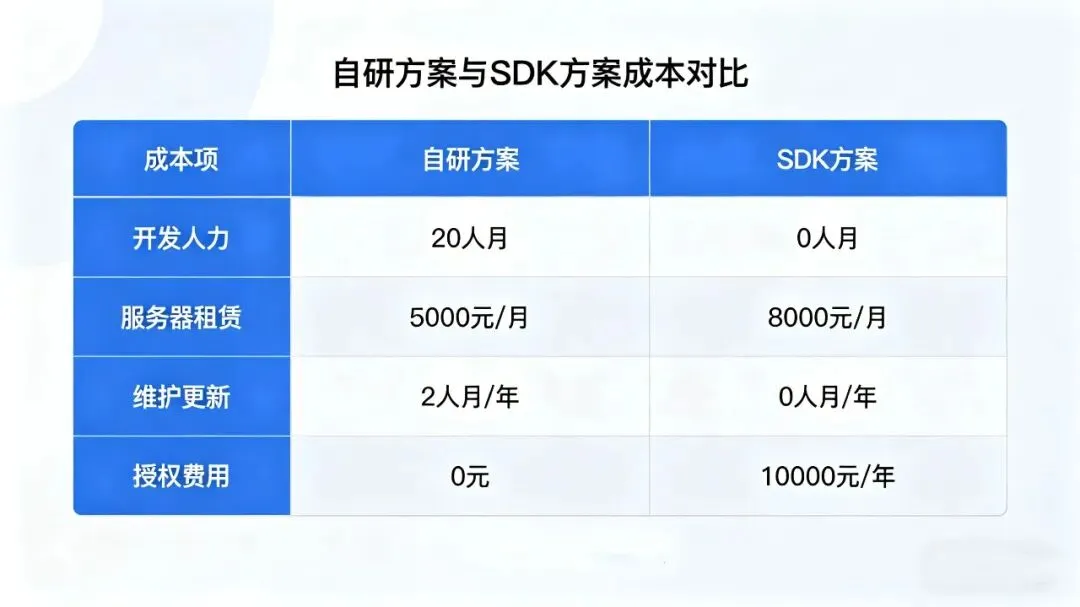 技术创业初期,每一分钱都需精打细算。自研方案不仅消耗数十万直接研发成本,更伴随着高昂的机会成本与试错风险。