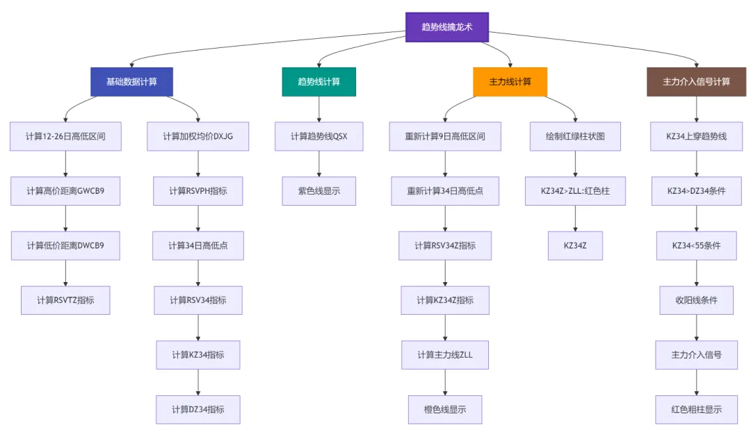 主力介入指标的核心逻辑建立在筹码端高度集中 + 价格端低位布局 + 盘口端强势拉升 + 筹码端高控盘的四维共振基础上。这意味着只有当这四个条件同时满足时,指标才会发出信号,从而有效过滤掉假突破和噪音信号。