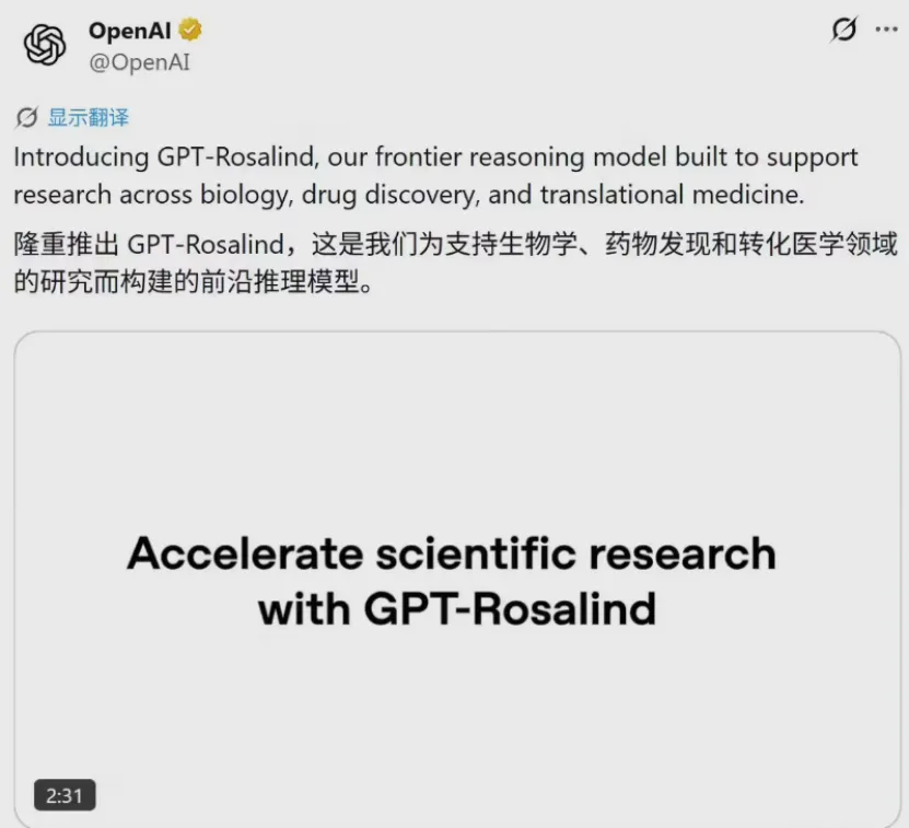 就在今天,OpenAI正式宣布推出GPT-Rosalind,一款专为生物学和药物研发打造的垂直领域推理模型!