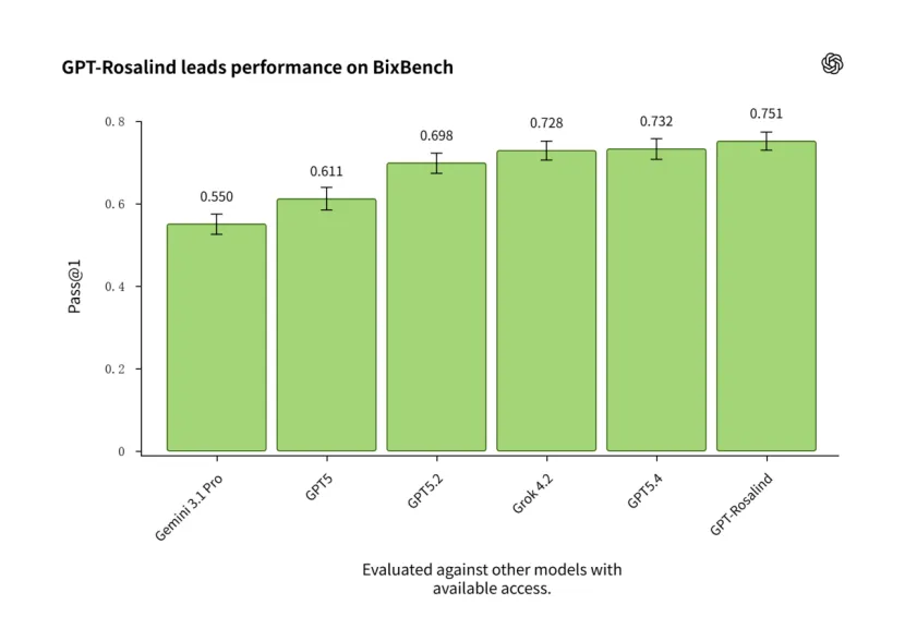 在BixBench基准测试中,GPT-Rosalind取得已公开模型中的顶尖成绩,超越了Grok4.2、GPT5.4等一众模型。