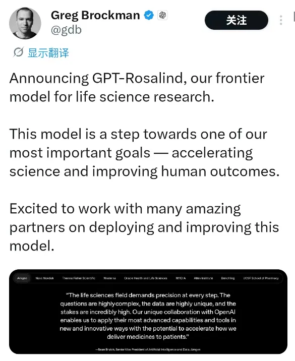 对于本次GPT-Rosalind新模型,OpenAI联合创始人兼总裁Greg Brockman也寄予厚望,表示加速科学进程并提升人类成果,是该公司最重要的目标之一