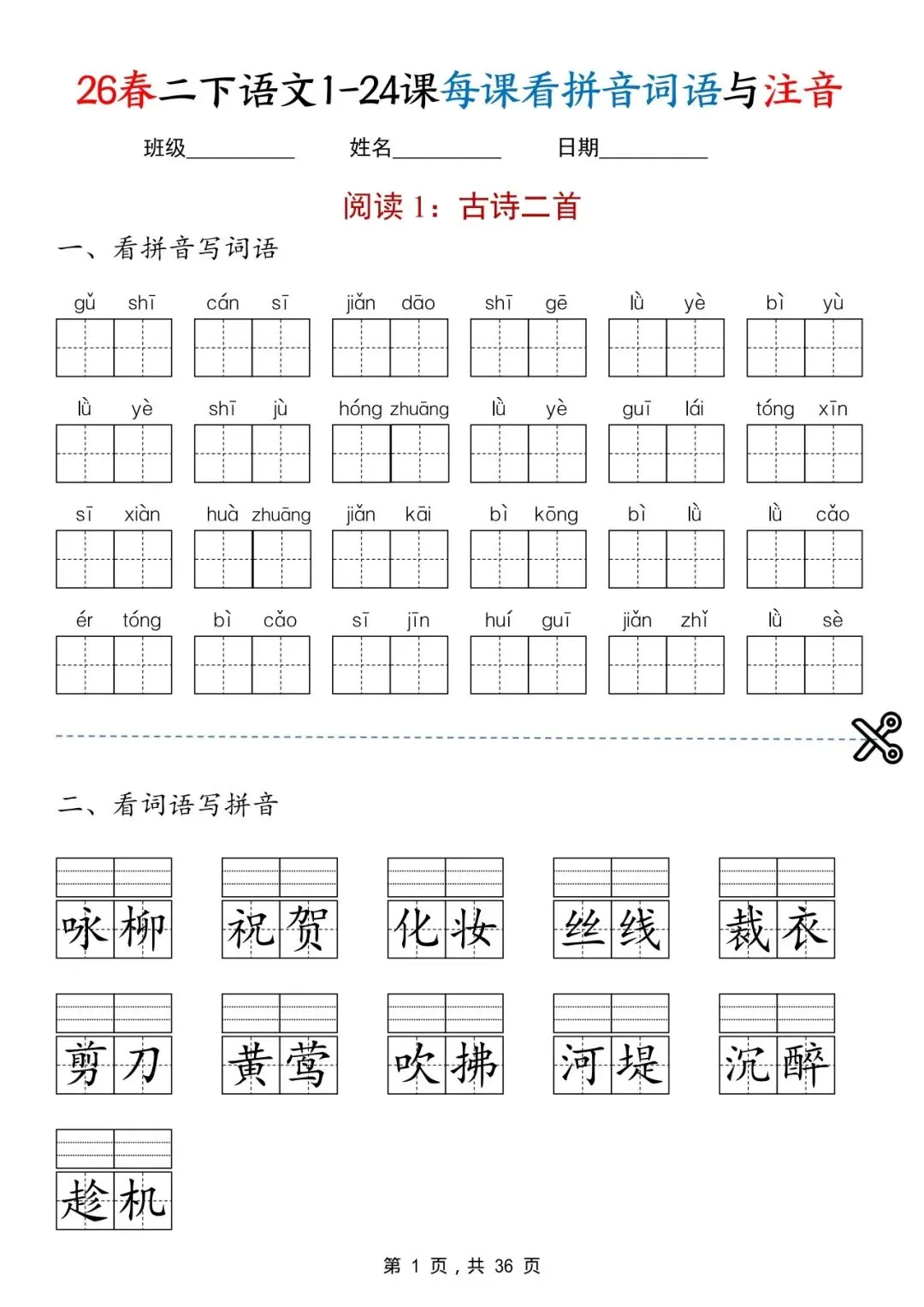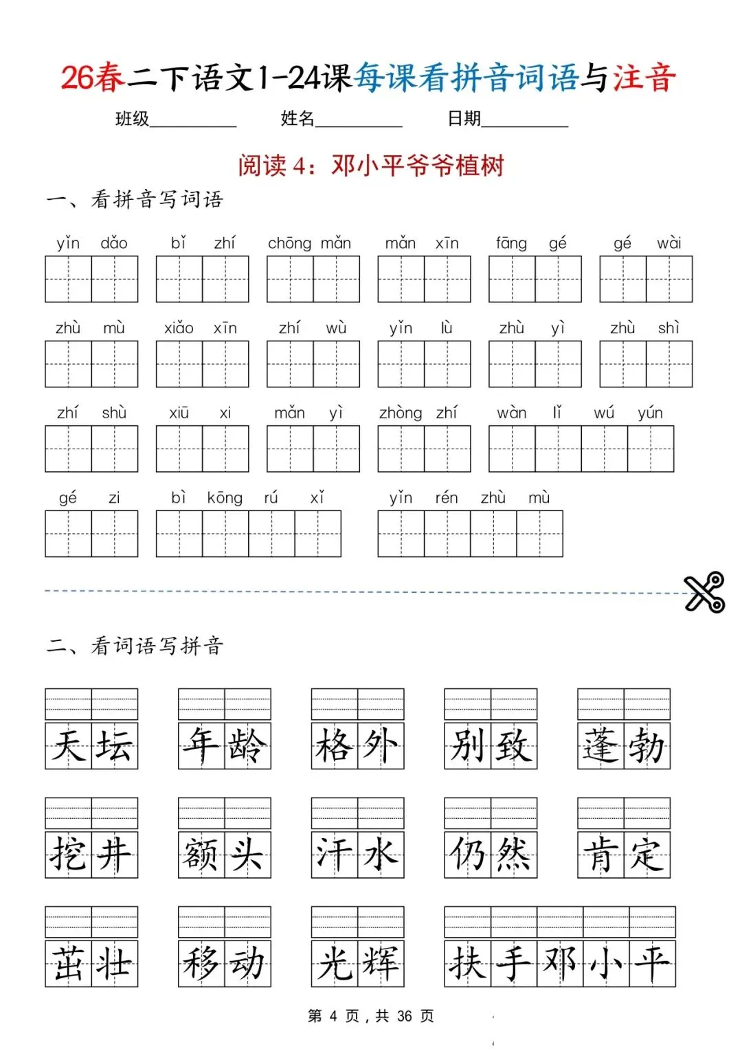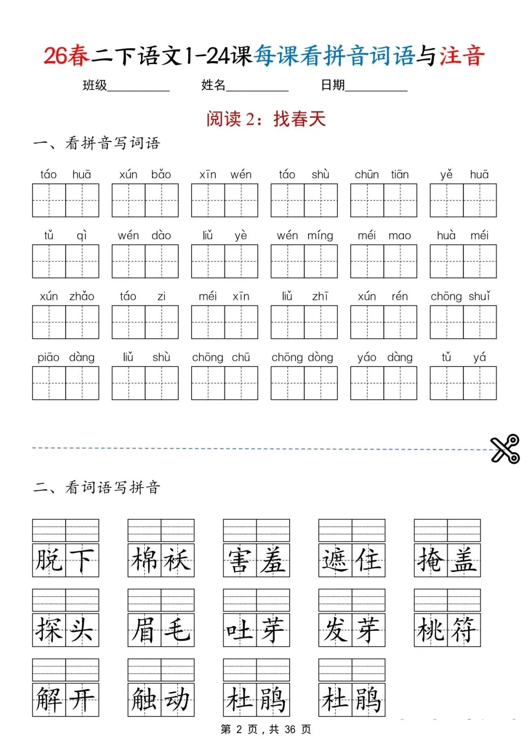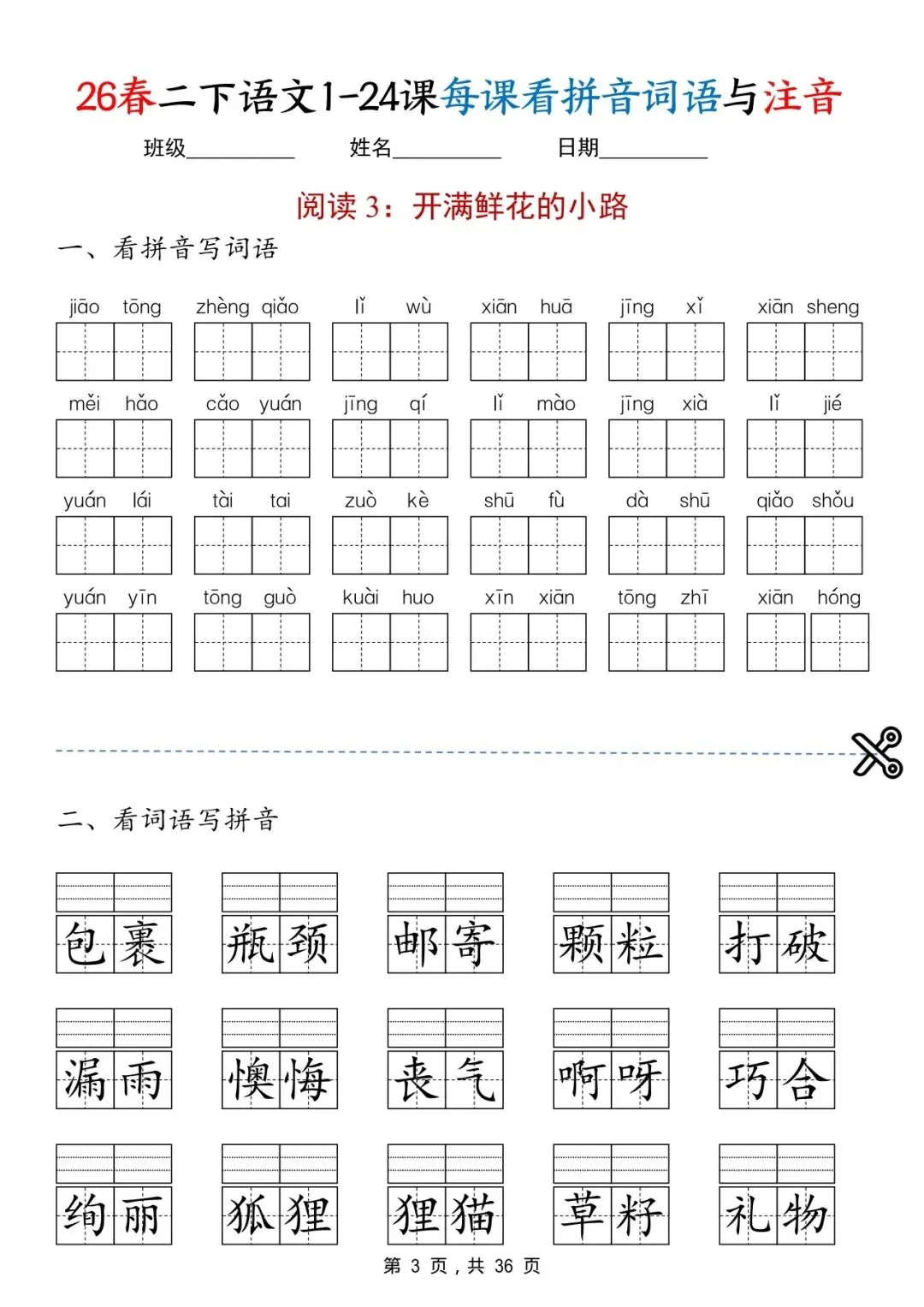 二年级是错别字高发期,每课看拼音写词语练习就像语文学习的“疫苗”——短期看能提高作业和考试正确率,长期看能培养准确、规范的书面表达能力,为三年级写作扫清基础障碍。建议坚持每课一练,但要注意趣味性和适度激励(如全对得一颗星)。