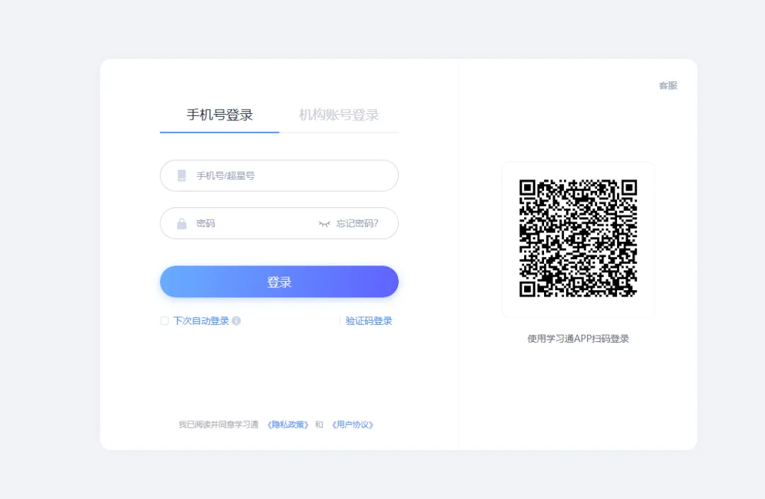 支持学习通账号密码、学习通APP扫码、手机验证码登录。