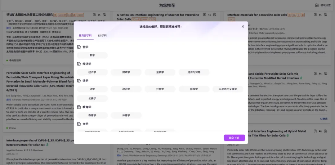 (1)首次登录,自动推送领域设置弹窗,用户进行选择(根据教育部学科分类、ESI学科进行勾选),可进行二次修改。