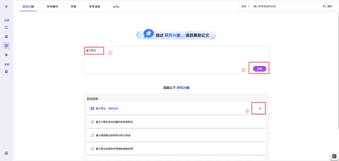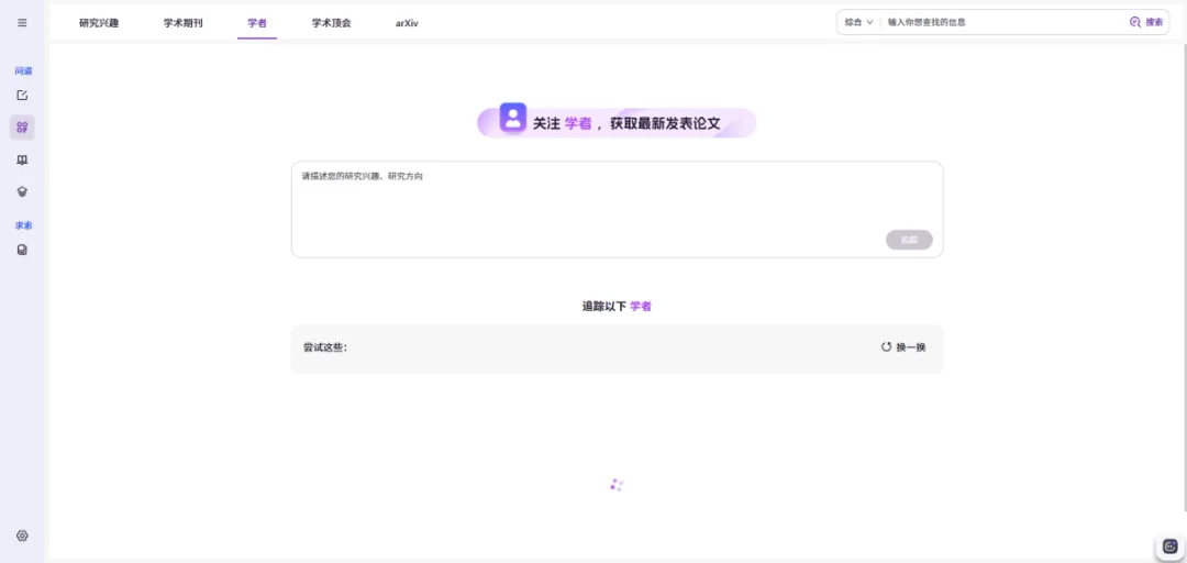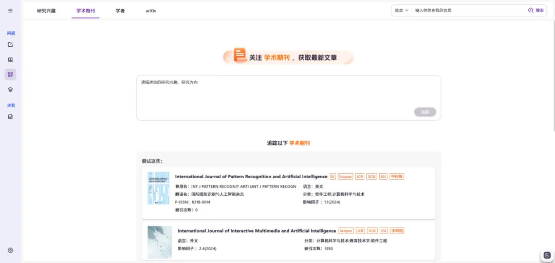 (1)关注学者:输入研究兴趣或方向,跟踪学者。