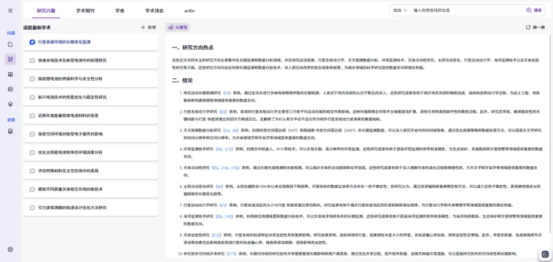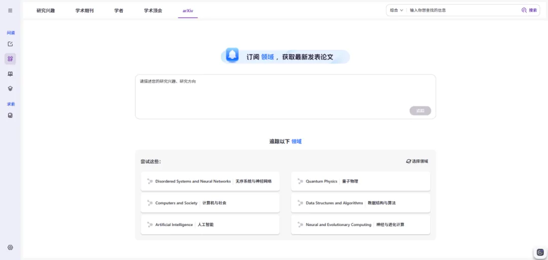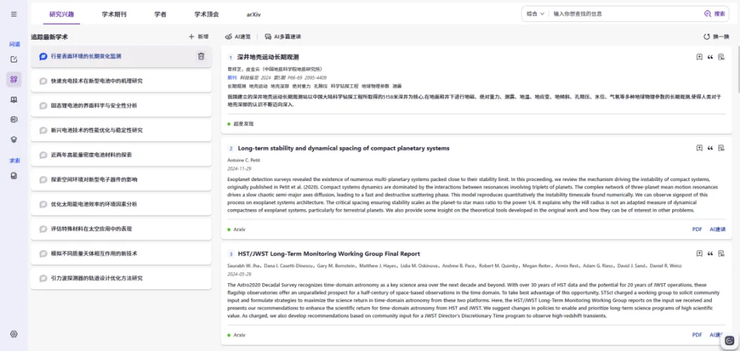 通过AI研判用户的研究方向、聚焦技术细节、关注特定应用场景、描述研究目标或是通过明确具体的研究问题等角度来设置兴趣点/订阅期刊/关注学者/学术顶会/机构资源。自动筛选并推送最新的相关主题论文,确保用户不错过任何重要的研究动态。